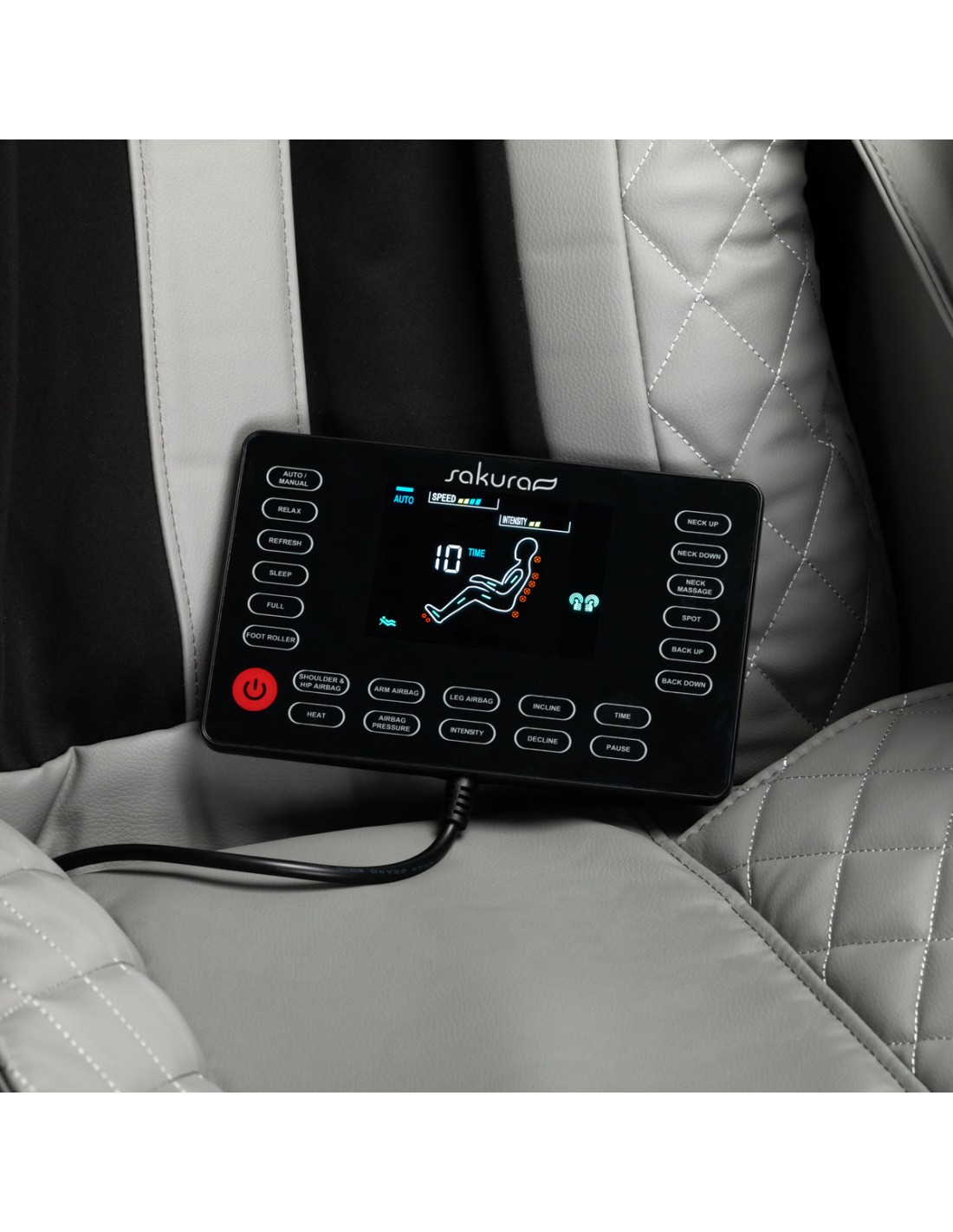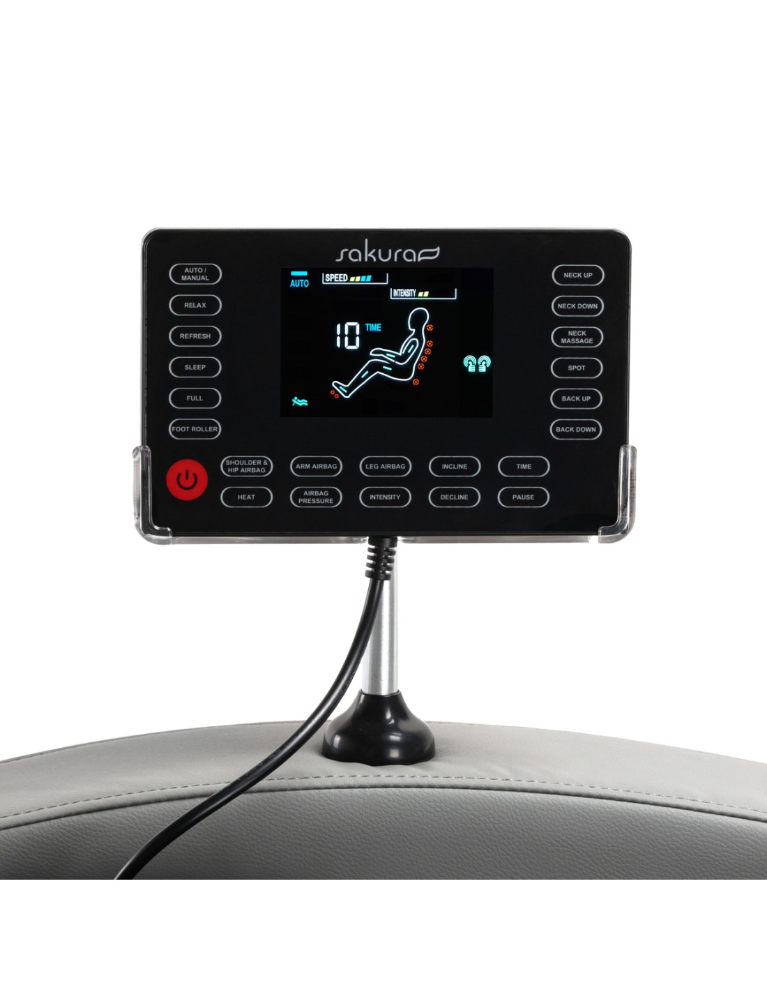 Il chiaro pannello di controllo rende l'utilizzo della poltrona semplice e piacevole. Per maggiore comodità, può essere posizionato sulla maniglia montata sul bracciolo destro o tenuto in mano. Il chiaro schermo LCD permette di seguire il funzionamento del dispositivo, visualizzando chiaramente le aree del corpo che vengono massaggiate, la loro intensità, la durata del trattamento e il programma selezionato. Il pannello consente di selezionare il programma di massaggio, di regolare liberamente le impostazioni della poltrona e le funzioni di massaggio, di regolare l'intensità e di impostare la durata del trattamento, che può essere di 15, 20, 25 o 30 minuti.