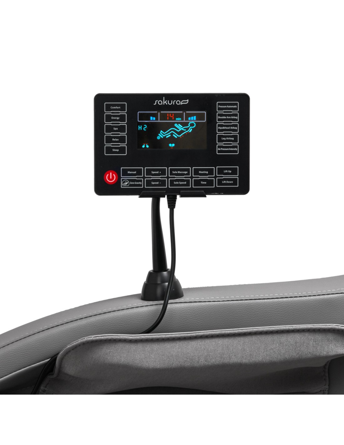 Grazie al chiaro pannello di controllo - che può essere posizionato sulla maniglia montata sul bracciolo destro o tenuto in mano - l'utilizzo della poltrona è facile e piacevole. Sul chiaro schermo LCD è possibile seguire il funzionamento del dispositivo. Le aree del corpo attualmente massaggiate, l'intensità, il tempo di trattamento e il programma selezionato sono visualizzati chiaramente. Il pannello consente di regolare liberamente le impostazioni della poltrona e le funzioni di massaggio, nonché di impostare la durata del trattamento, che può durare 5, 10, 15, 20, 25 o 30 minuti.
