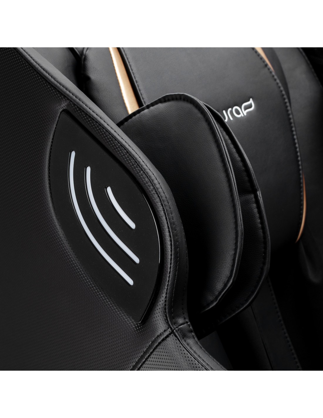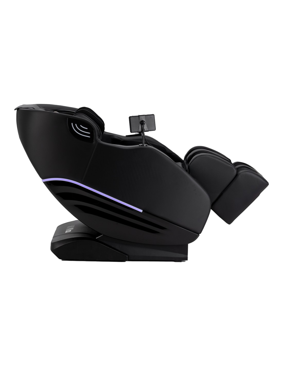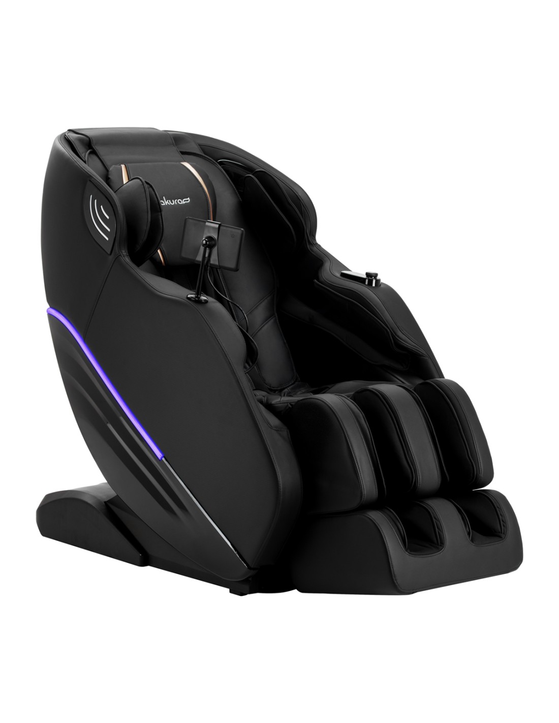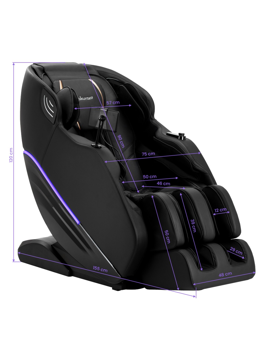 La poltrona è dotata di un sistema di riscaldamento della schiena e dei polpacci che aiuta a rilassare i muscoli tesi, aumentando il piacere e l'efficacia del massaggio. La regolazione meccanica dell'estensione del poggiapiedi consente di adattare perfettamente la poltrona all'altezza dell'utente, garantendo una posizione comoda ed ergonomica durante ogni sessione. Inoltre, il modello è stato arricchito con elementi laterali illuminati che gli conferiscono un carattere moderno ed elegante, creando un'atmosfera piacevole e rilassante e fungendo da elemento decorativo che arricchisce l'arredamento degli interni.