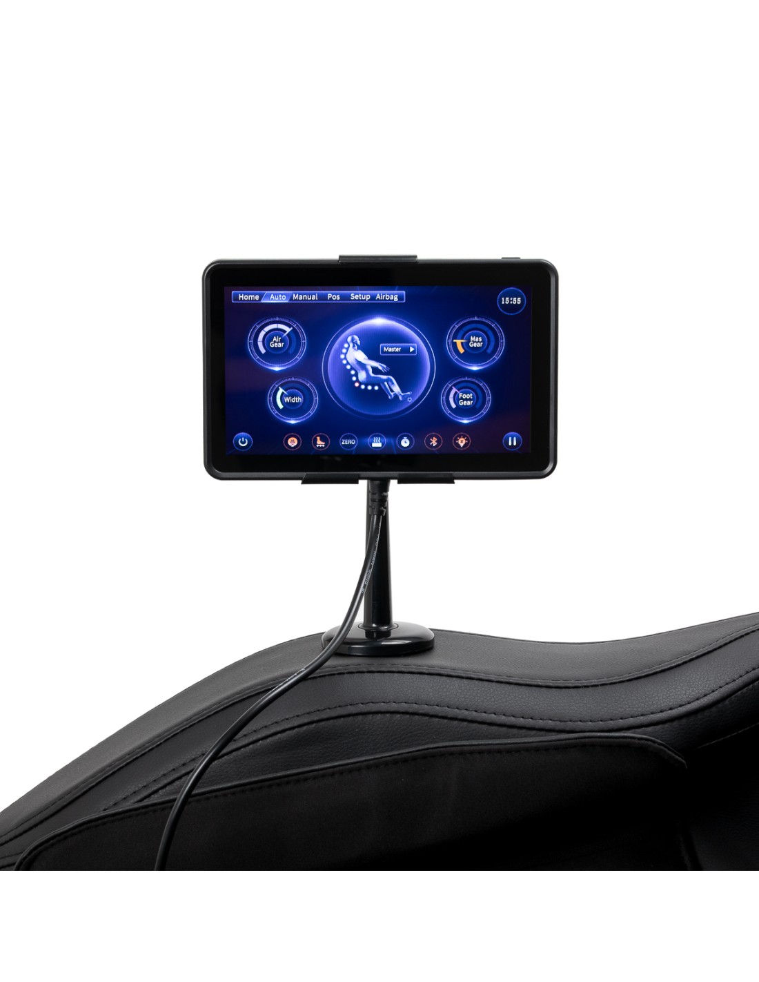 Il pannello di controllo consente di adattare facilmente il massaggio alle esigenze individuali. Per una maggiore comodità, può essere posizionato nell'apposito supporto sul bracciolo destro o tenuto in mano. Lo schermo mostra chiaramente tutte le informazioni chiave: le parti del corpo attualmente massaggiate, l'intensità del massaggio, la durata della sessione e il programma selezionato. Il pannello consente di passare dalla modalità automatica a quella manuale e diattivare il controllo vocale, aumentando il comfort di utilizzo. Con esso è possibile scegliere comodamente tra le modalità di massaggio disponibili, regolare l'intensità, adattare le impostazioni della poltrona e regolare con precisione la durata della sessione a intervalli di 5 minuti (5, 10, 15, 20, 25 o 30 minuti), garantendo una durata del massaggio ideale in base alle esigenze dell'utente.