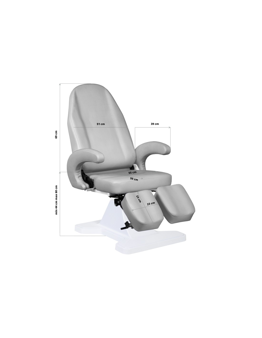 Una poltrona cosmetica moderna, che offre comfort durante il trattamento, non solo per i pazienti ma anche per le persone che lo eseguono. La poltrona è robusta e molto stabile. I poggiapiedi regolabili consentono di adattare ulteriormente la poltrona alle esigenze individuali. Il rivestimento è in ecopelle di alta qualità. Design moderno e funzionalità in un unico prodotto. Dimensioni della base: 76 cm x 60 cm