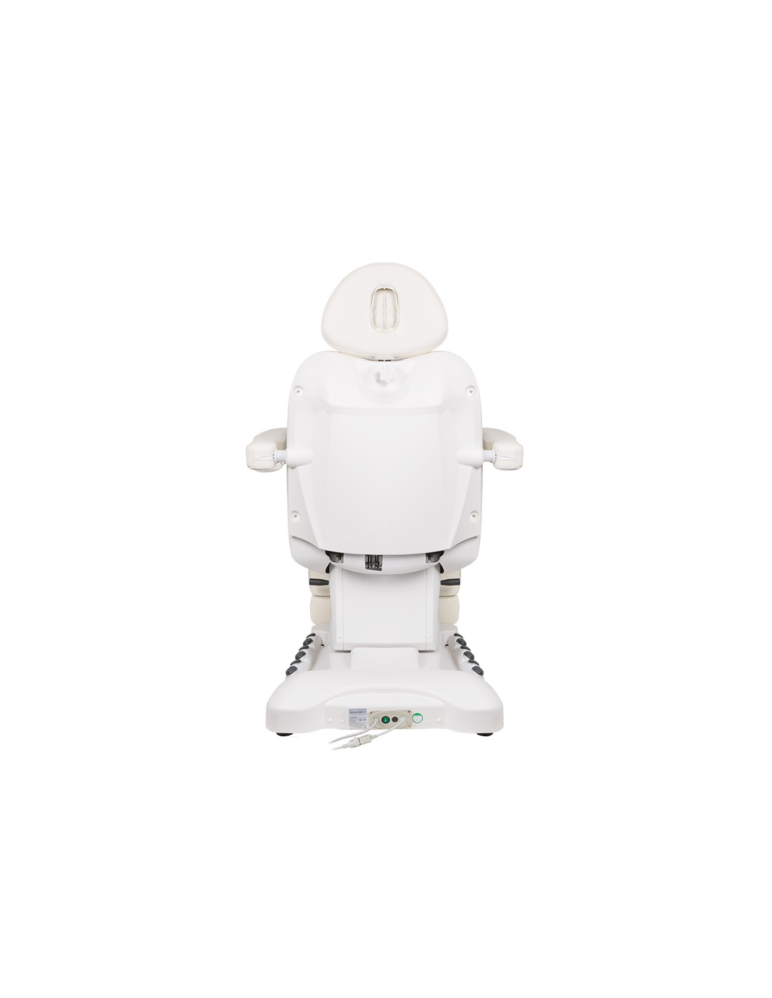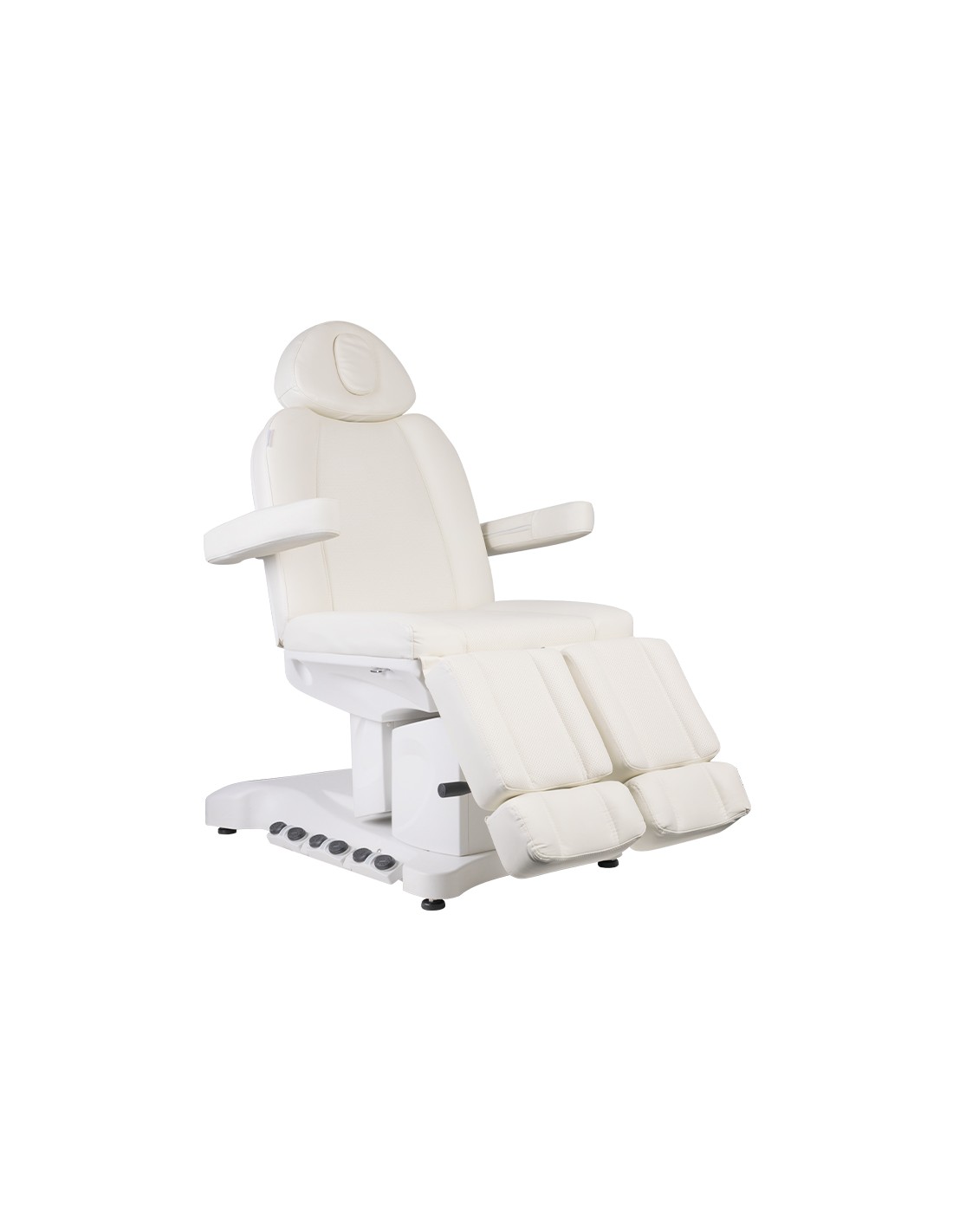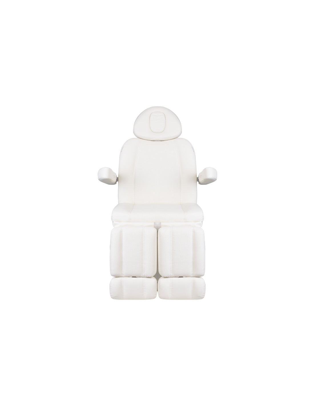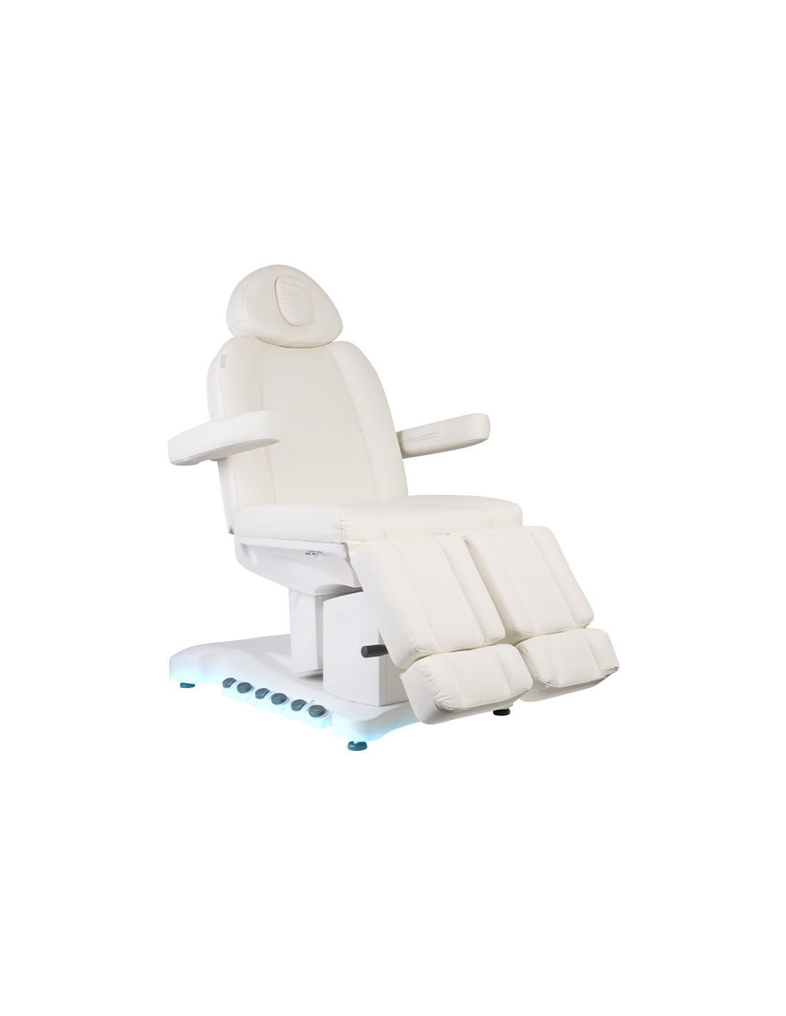 Una poltrona estetica elettrica eccezionale, ideale per i saloni di bellezza e le SPA. Grazie ad attuatori indipendenti, consente la regolazione della poltrona su 3 piani piani con l'uso di un telecomando e di interruttori a pedale. dando la possibilità di eseguire comodamente trattamenti di pedicure, viso e corpo. Tramite il telecomando è possibile utilizzare le impostazioni pre-programmate e attivare la funzione HOT, ovvero il riscaldamento. La poltrona è dotata di un'imbottitura traforata non presente in altre poltrone e di un'illuminazione a LED colorata della base.