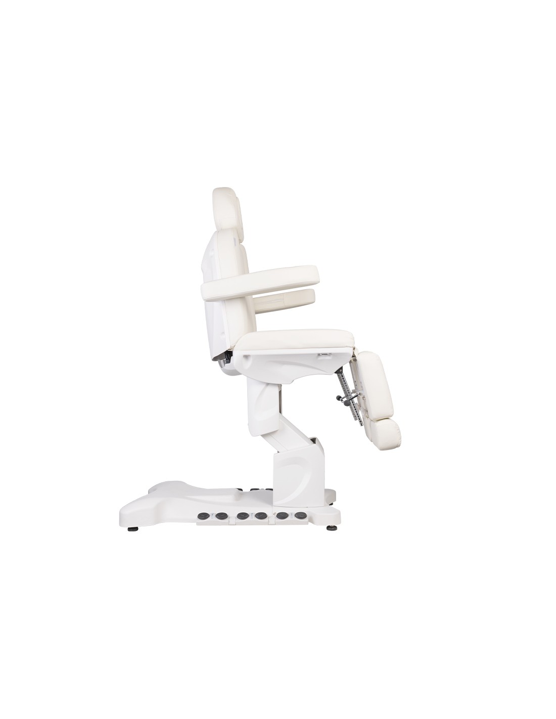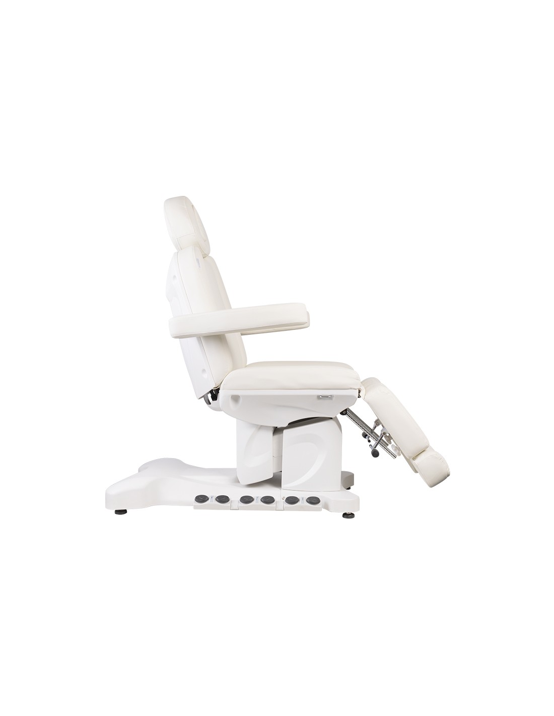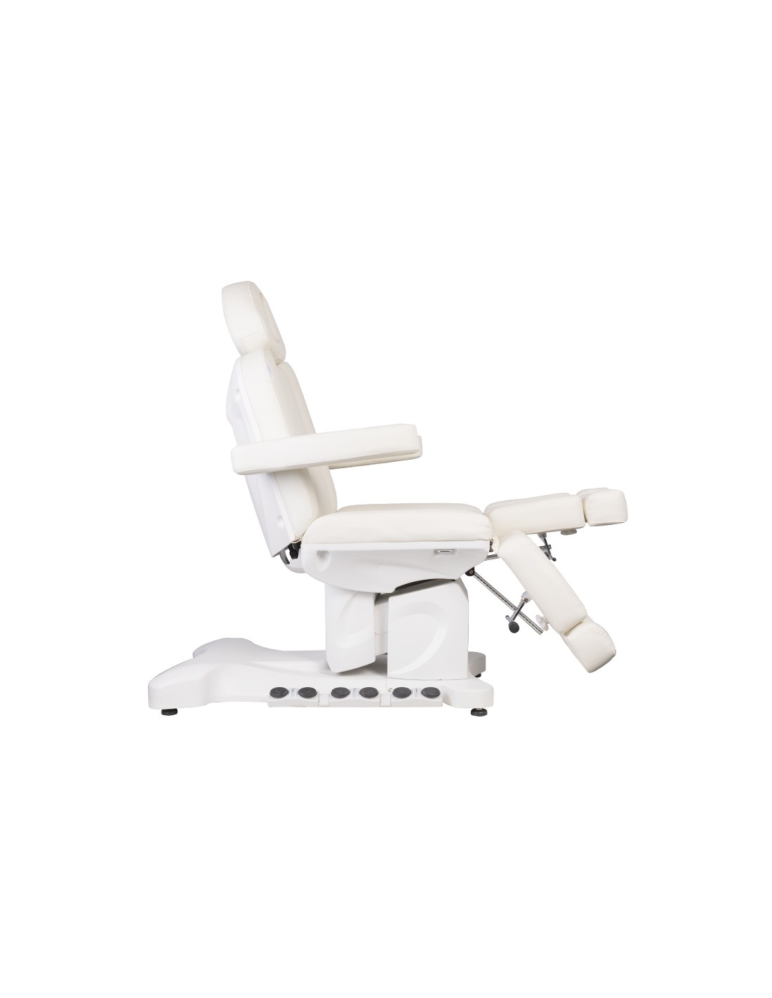 Una poltrona estetica elettrica eccezionale, ideale per i saloni di bellezza e le SPA. Grazie ad attuatori indipendenti, consente la regolazione della poltrona su 3 piani piani con l'uso di un telecomando e di interruttori a pedale. dando la possibilità di eseguire comodamente trattamenti di pedicure, viso e corpo. Tramite il telecomando è possibile utilizzare le impostazioni pre-programmate e attivare la funzione HOT, ovvero il riscaldamento. La poltrona è dotata di un'imbottitura traforata non presente in altre poltrone e di un'illuminazione a LED colorata della base.