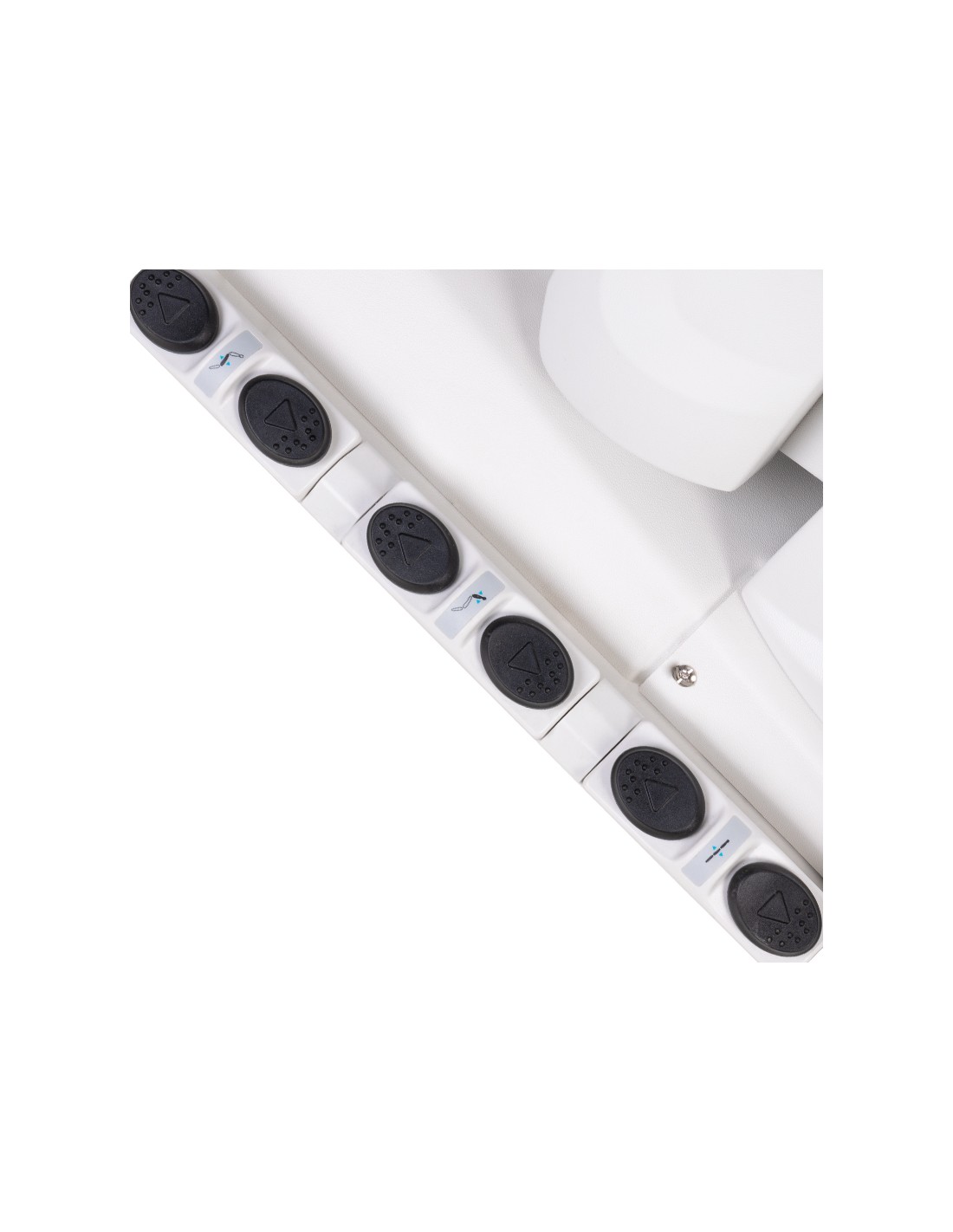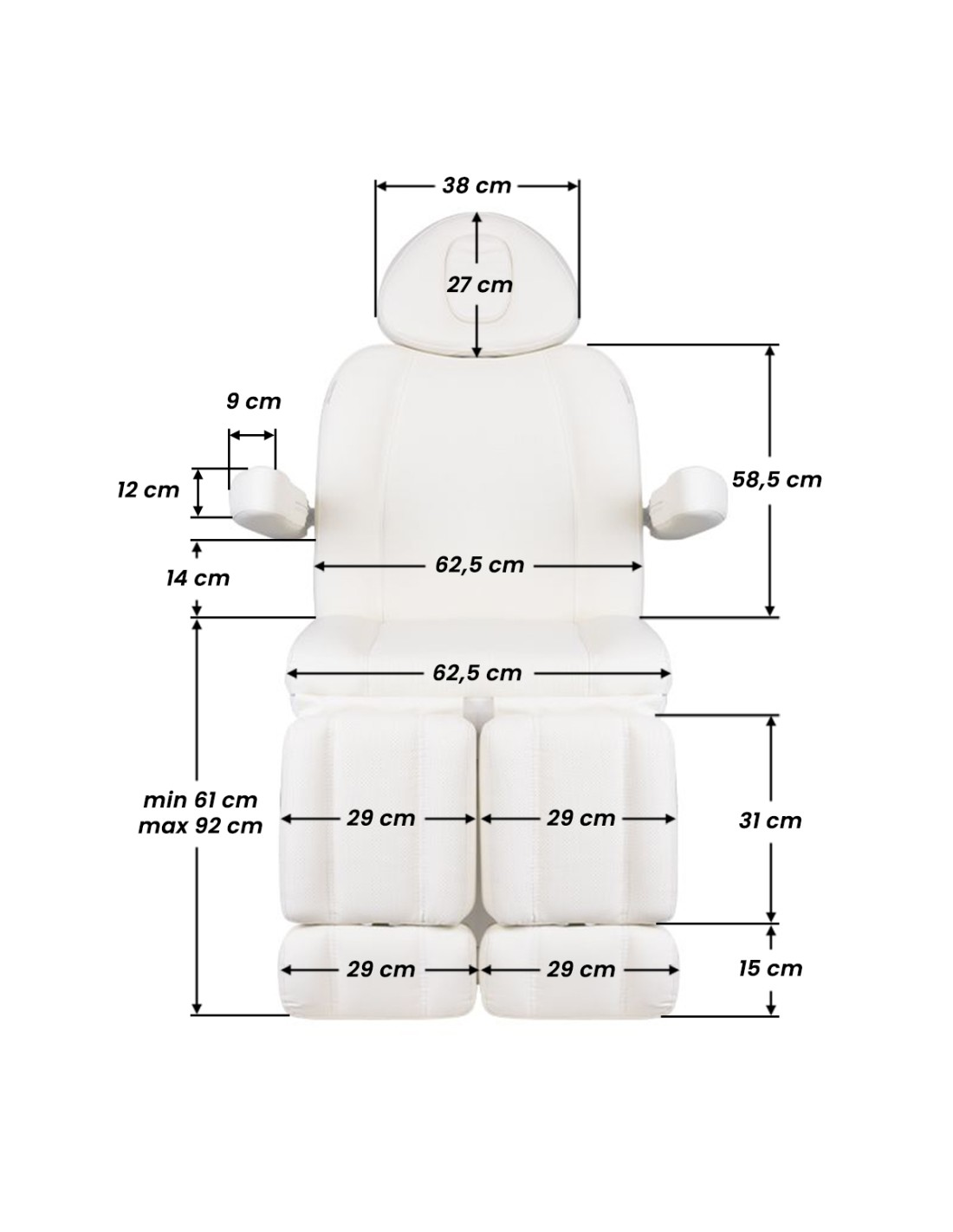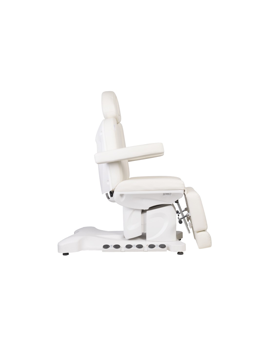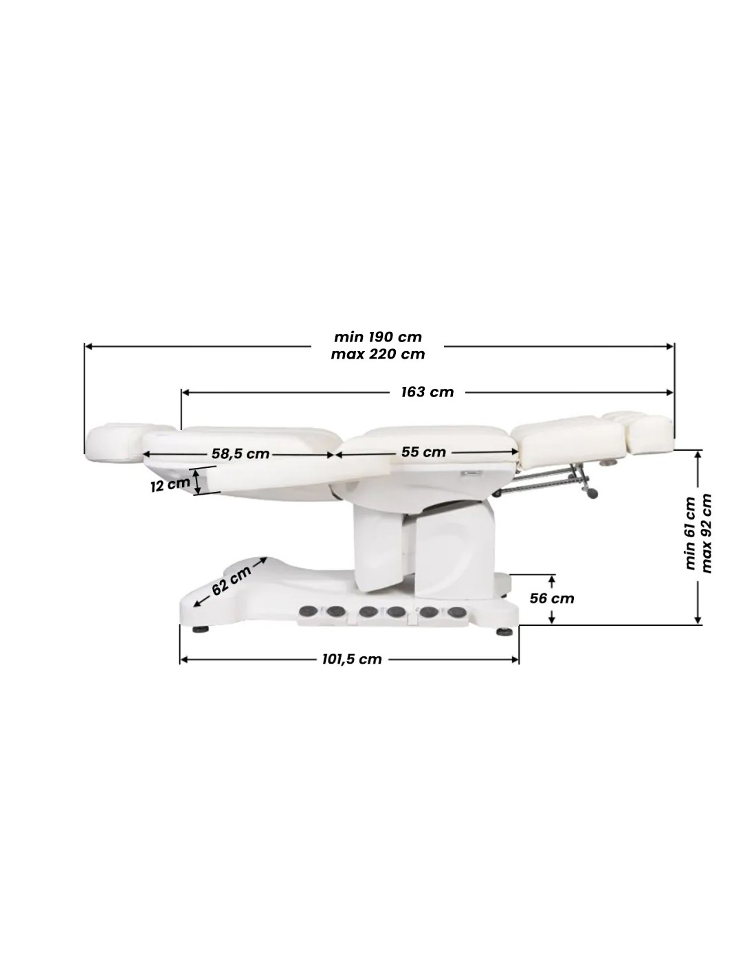 Una poltrona estetica elettrica eccezionale, ideale per i saloni di bellezza e le SPA. Grazie ad attuatori indipendenti, consente la regolazione della poltrona su 3 piani piani con l'uso di un telecomando e di interruttori a pedale. dando la possibilità di eseguire comodamente trattamenti di pedicure, viso e corpo. Tramite il telecomando è possibile utilizzare le impostazioni pre-programmate e attivare la funzione HOT, ovvero il riscaldamento. La poltrona è dotata di un'imbottitura traforata non presente in altre poltrone e di un'illuminazione a LED colorata della base.