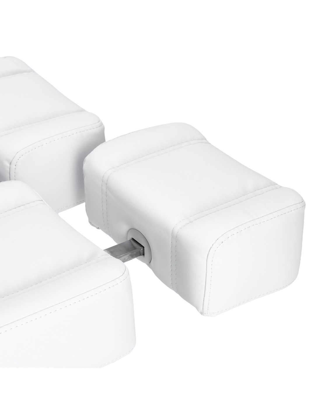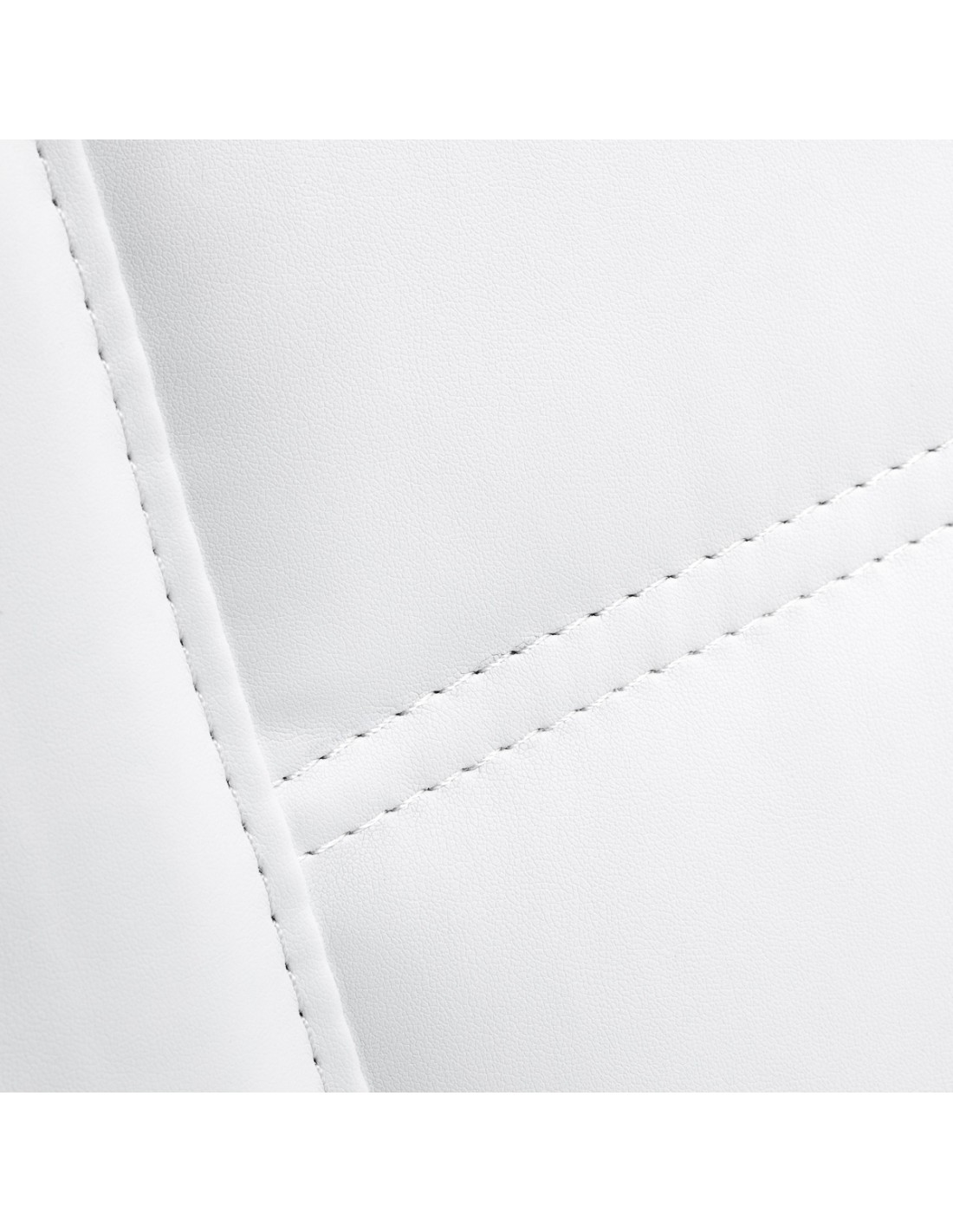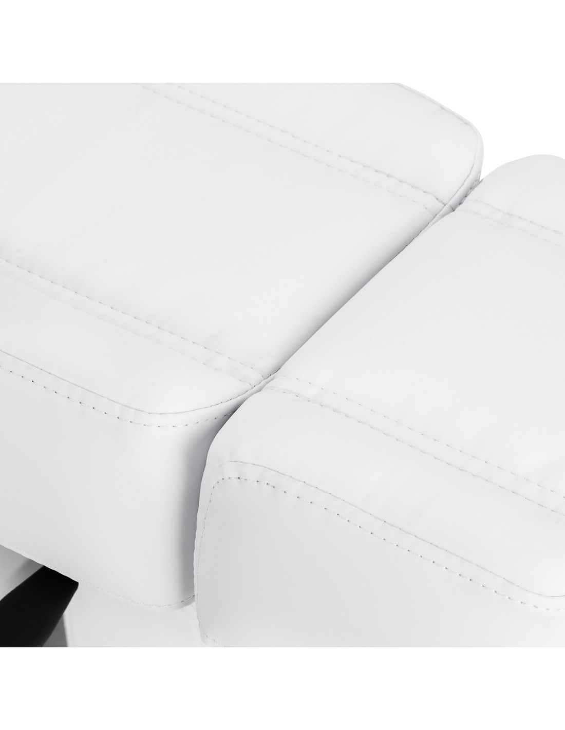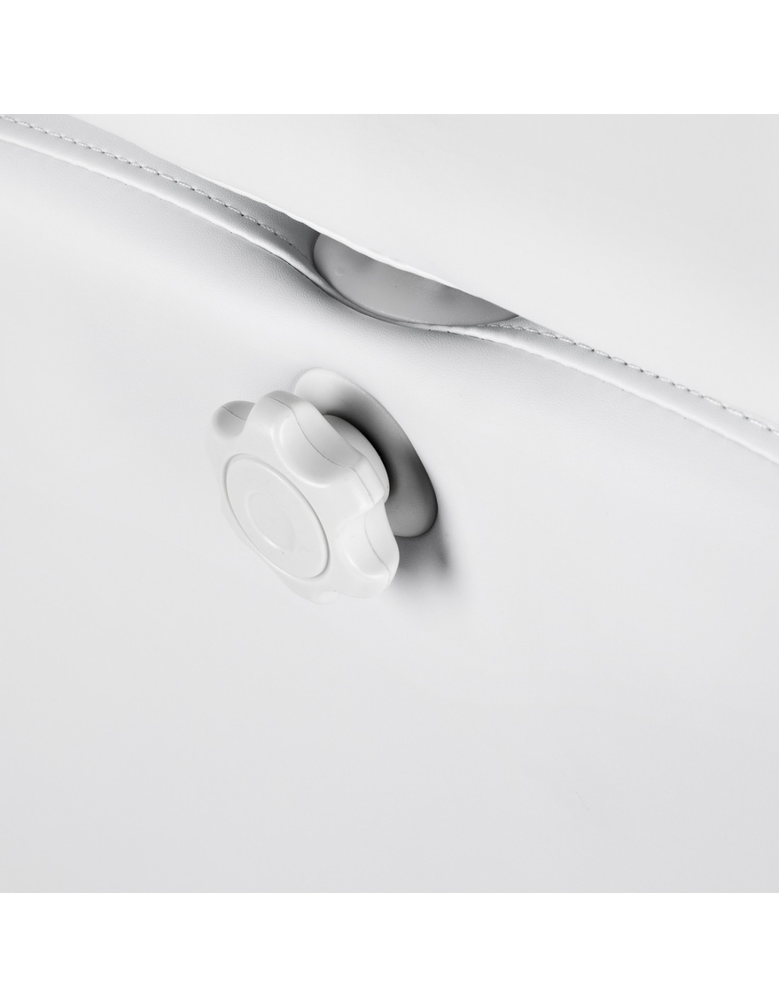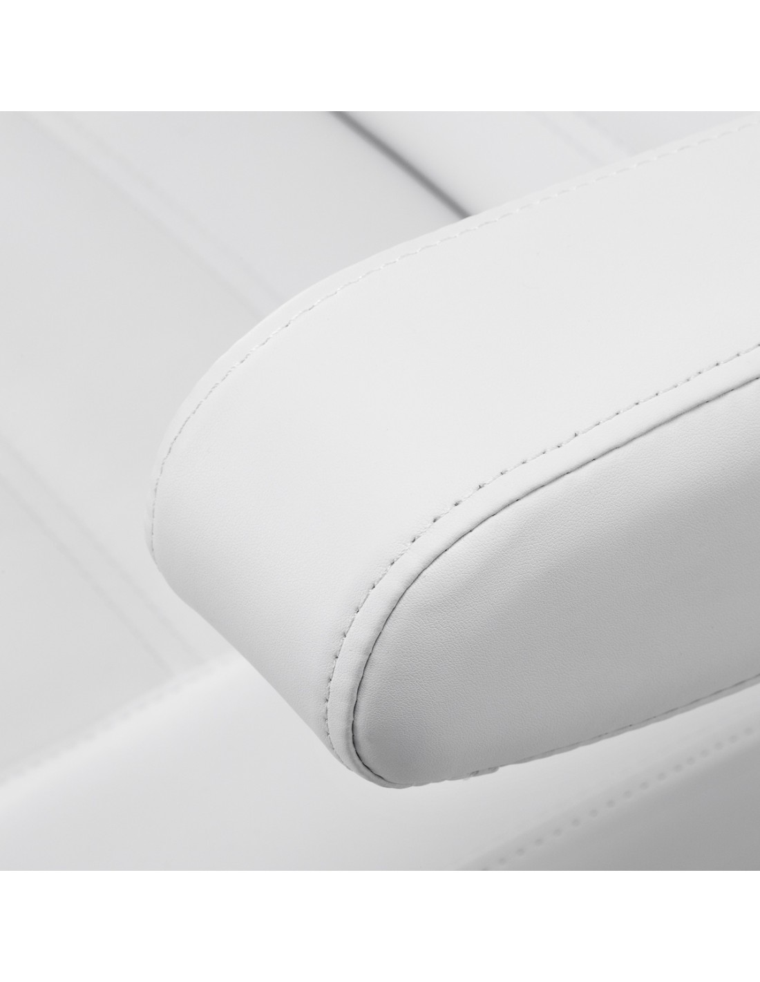 La solida struttura della poltrona garantisce stabilità e resistenza, mentre la seduta imbottita con schiuma di adeguata durezza assicura il comfort anche durante trattamenti di lunga durata. Il rivestimento in similpelle di alta qualità, piacevole al tatto, nei toni del bianco conferisce all'insieme un aspetto professionale, ed è allo stesso tempo resistente all'umidità e facile da pulire. La base resistente e le finiture precise sottolineano il carattere moderno della poltrona e influiscono sull'ergonomia della seduta.