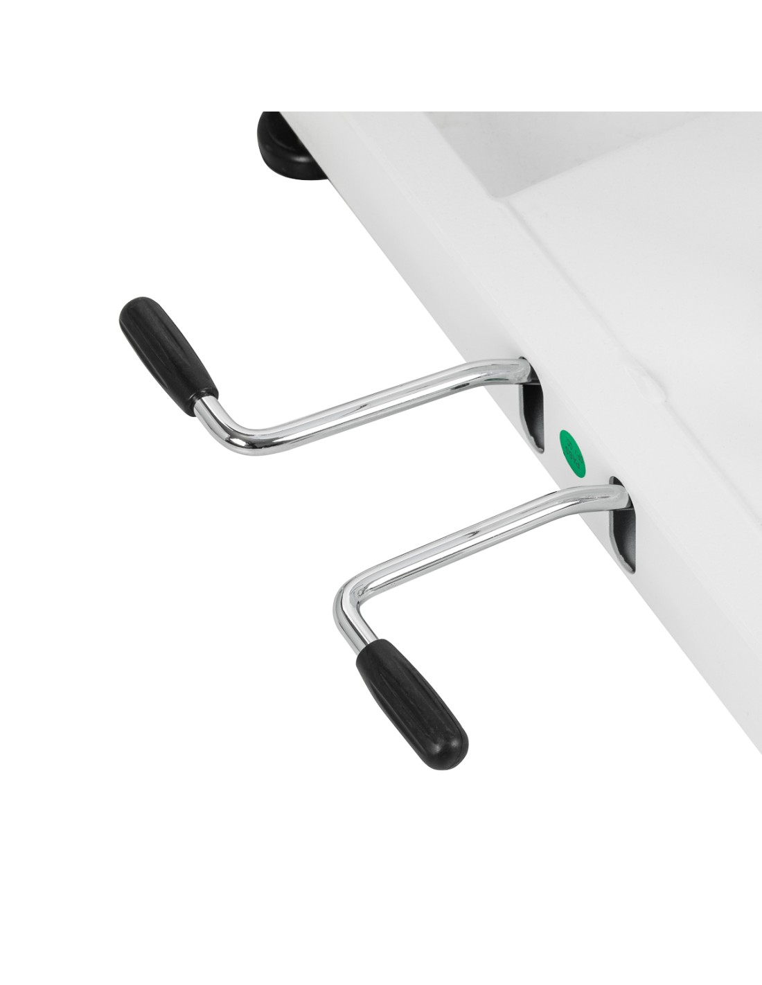 Il comando tramite telecomando con cavo consente di regolare l'altezza del sedile in un intervallo compreso tra 63 e 85 cm. La gamma di regolazioni consente di adattare facilmente la posizione al tipo di trattamento eseguito, tenendo conto del comfort del cliente e dell'ergonomia del lavoro dello specialista. Per una maggiore comodità d'uso, il telecomando può essere appeso ai supporti situati su entrambi i lati del sedile.
