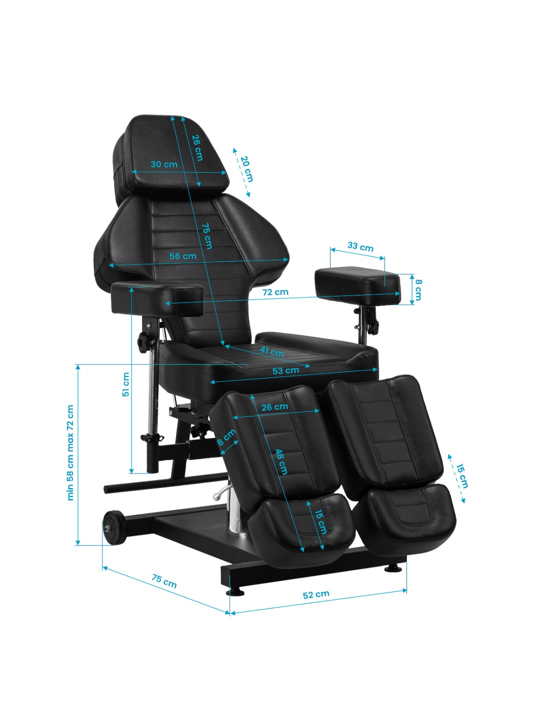 Il design minimalista e la combinazione di colori classici rendono la poltrona ideale per l'estetica degli studi di tatuaggi, migliorando al contempo l'efficienza del lavoro. La sagomatura ergonomica e la schiuma resistente alla deformazione assicurano una posizione confortevole durante la seduta sia per il tatuato che per l'artista. Il rivestimento in pelle sintetica di alta qualità nei toni del nero e la base stabile garantiscono durata, comfort d'uso e facilità di manutenzione. Il design funzionale della poltrona offre un'ampia gamma di possibilità di regolazione, che si traduce in un elevato comfort. Inoltre, le ruote situate in una parte della base ne facilitano lo spostamento.