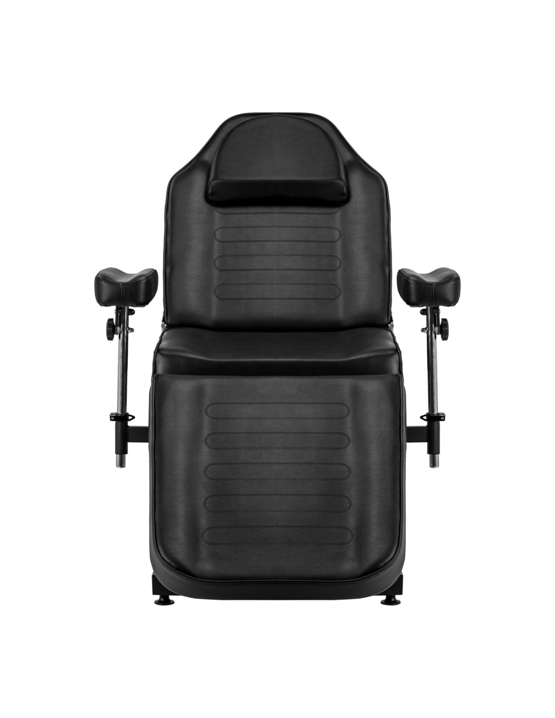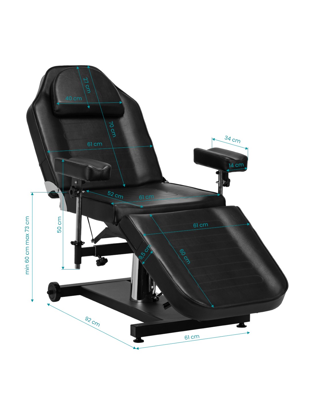 La poltrona è dotata di un attuatore idraulico che consente di regolare agevolmente l'altezza da 60 a 73 cm. Sia lo schienale che il poggiapiedi sono dotati di una regolazione manuale dell'angolo, che consente un posizionamento personalizzato in base al tipo di procedura da eseguire. I braccioli mobili e incassati sono facili da rimuovere e regolare. Consentono di regolare l'angolo, l'altezza e l'inclinazione, offrendo un supporto confortevole e stabile e una maggiore libertà di lavoro per il tatuatore. Tutte queste caratteristiche aumentano il comfort del cliente e facilitano la precisione del tatuaggio.