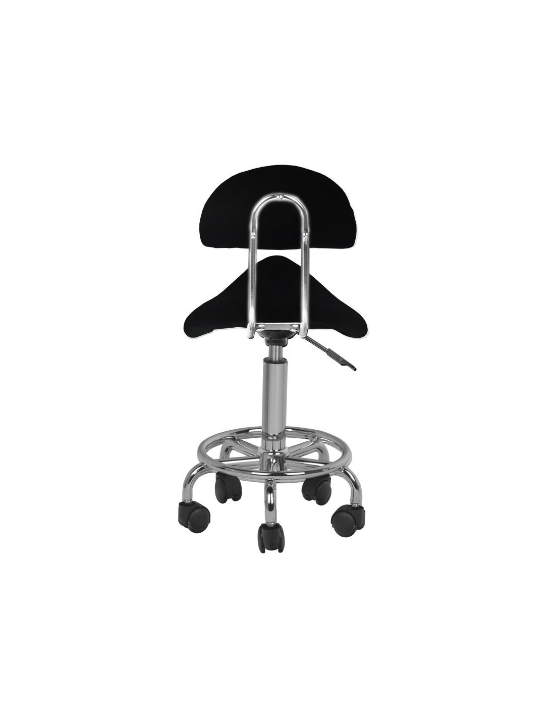 Sgabello cosmetico comodo e stabile con schienale, con sedile profilato, su base a cinque razze con rotelle in plastica. Disponibile in NERO, un elemento d'arredo indispensabile in uno studio estetico.