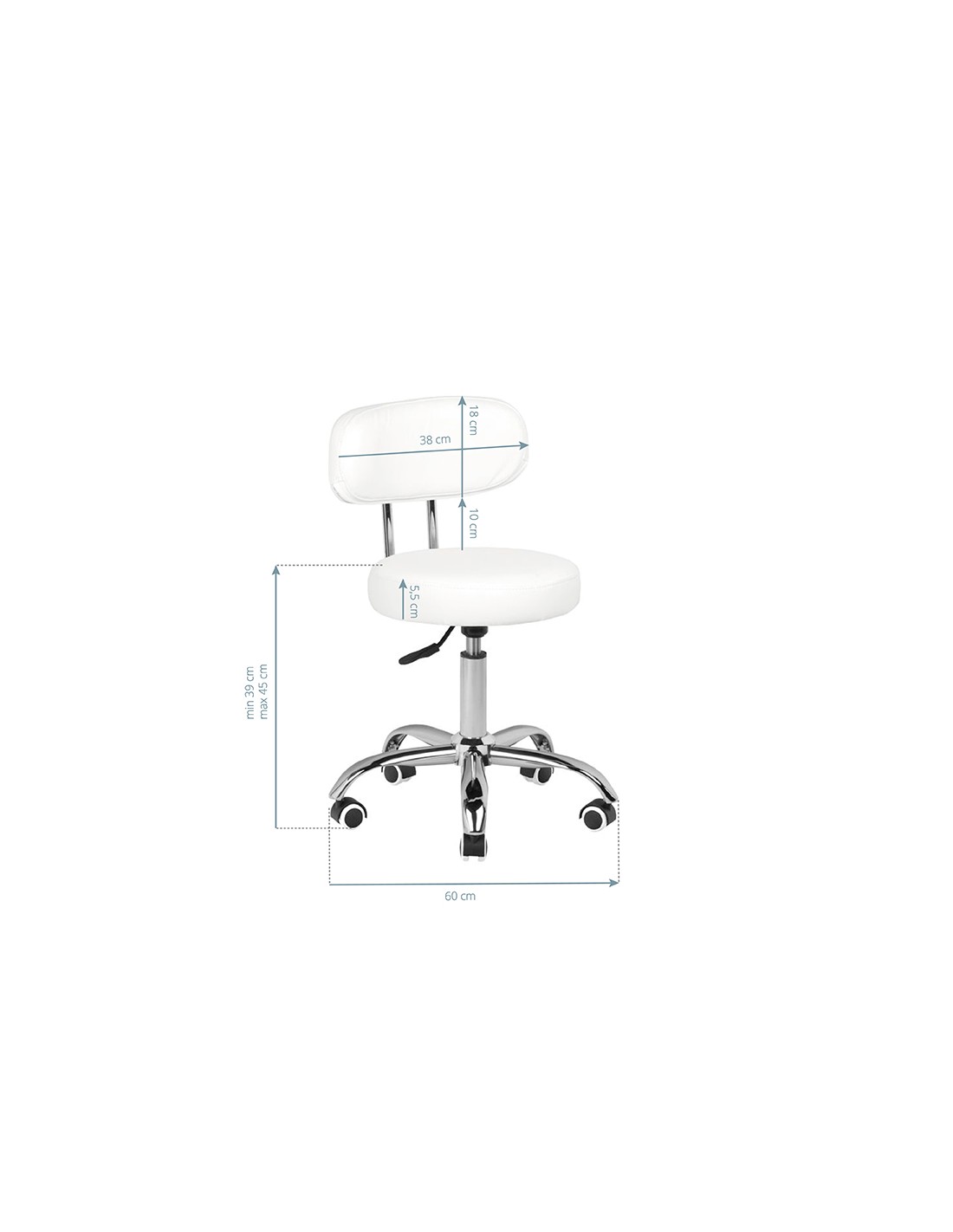 Comodo sgabello cosmetico in pelle ecologica, ideale per la pedicure. Struttura stabile su base a cinque razze, con rotelle gommate, disponibile in bianco.  Altezza regolabile idraulicamente.     Dimensioni della confezione: 55*49*40