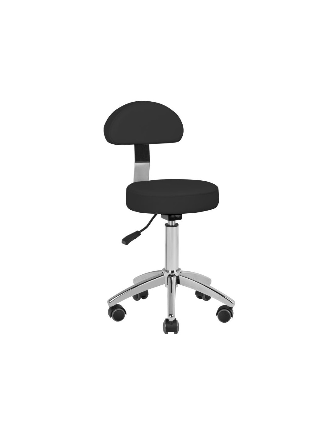 Comodo sgabello cosmetico, stabile su base a cinque stelle, con ruote in gomma, con possibilità di smontare lo schienale, di colore nero, un elemento d'arredo indispensabile in un salone di bellezza.