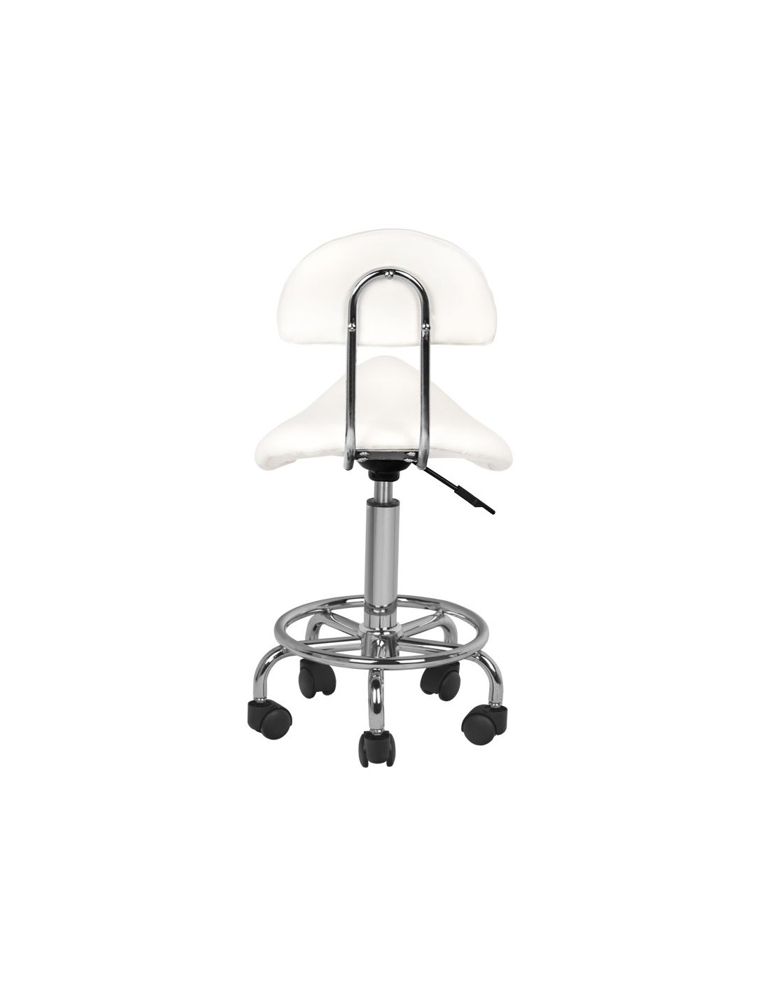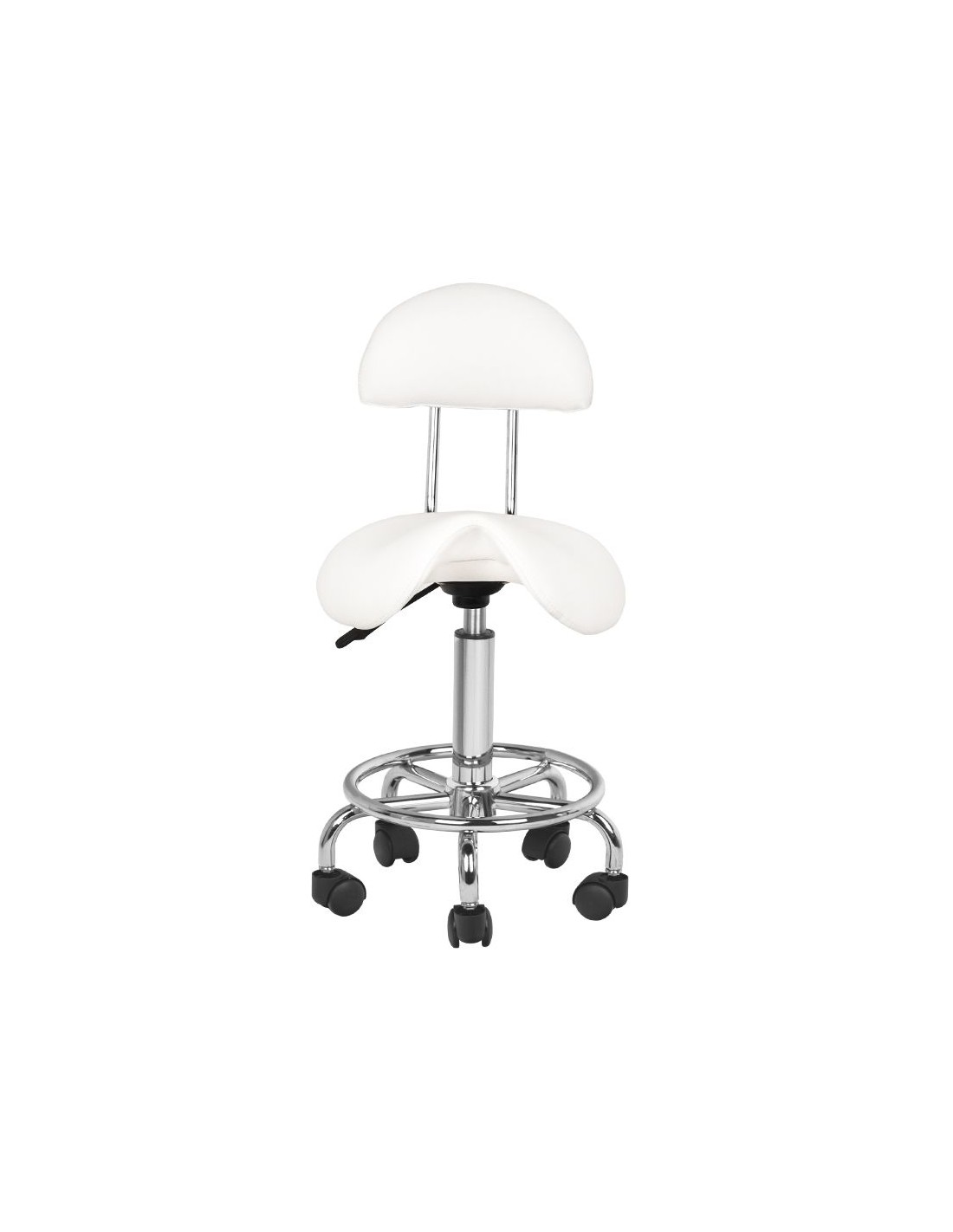 Sgabello cosmetico comodo e stabile con schienale, con seduta profilata, su base a cinque razze con rotelle in plastica. Disponibile in BIANCO, un elemento d'arredo indispensabile in uno studio estetico.