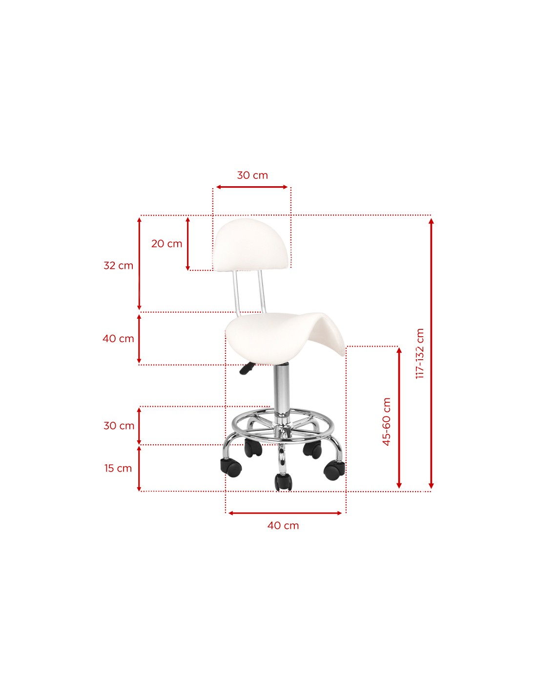 Sgabello cosmetico comodo e stabile con schienale, con seduta profilata, su base a cinque razze con rotelle in plastica. Disponibile in BIANCO, un elemento d'arredo indispensabile in uno studio estetico. dimensioni della confezione: 40x40x23 cm