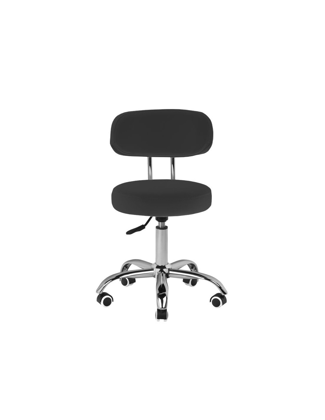 Comodo sgabello cosmetico in pelle ecologica, ideale per la pedicure. Struttura stabile su base a cinque razze, con rotelle gommate, disponibile in nero. Altezza controllata idraulicamente.