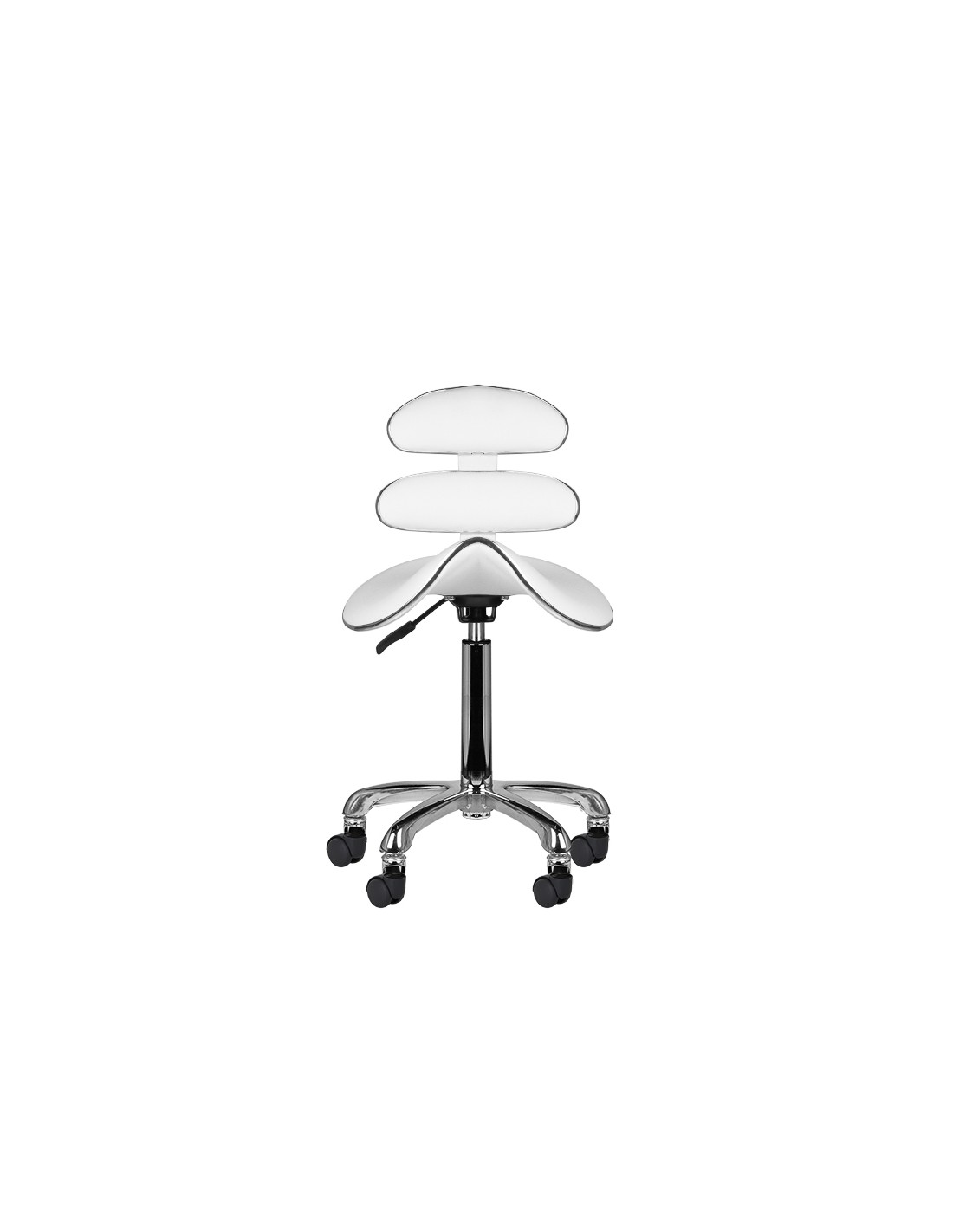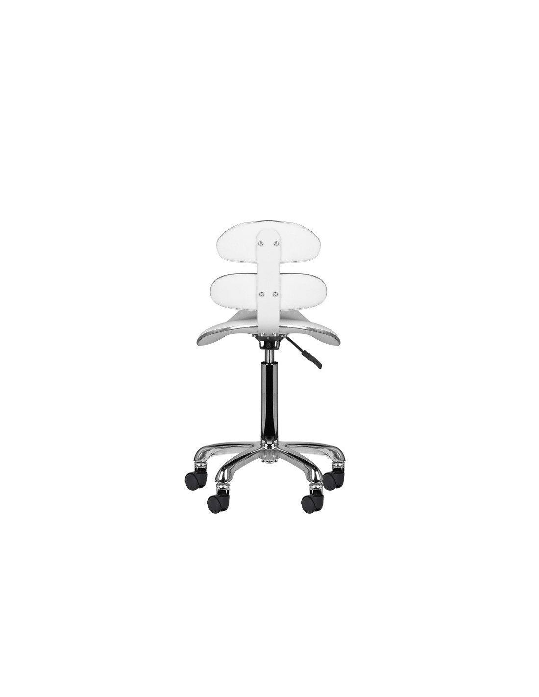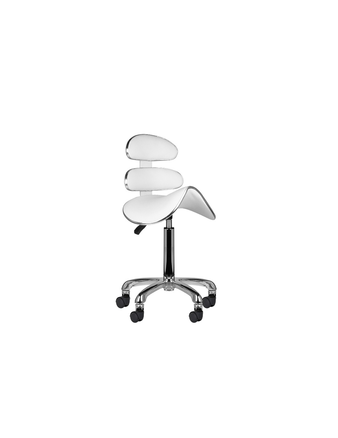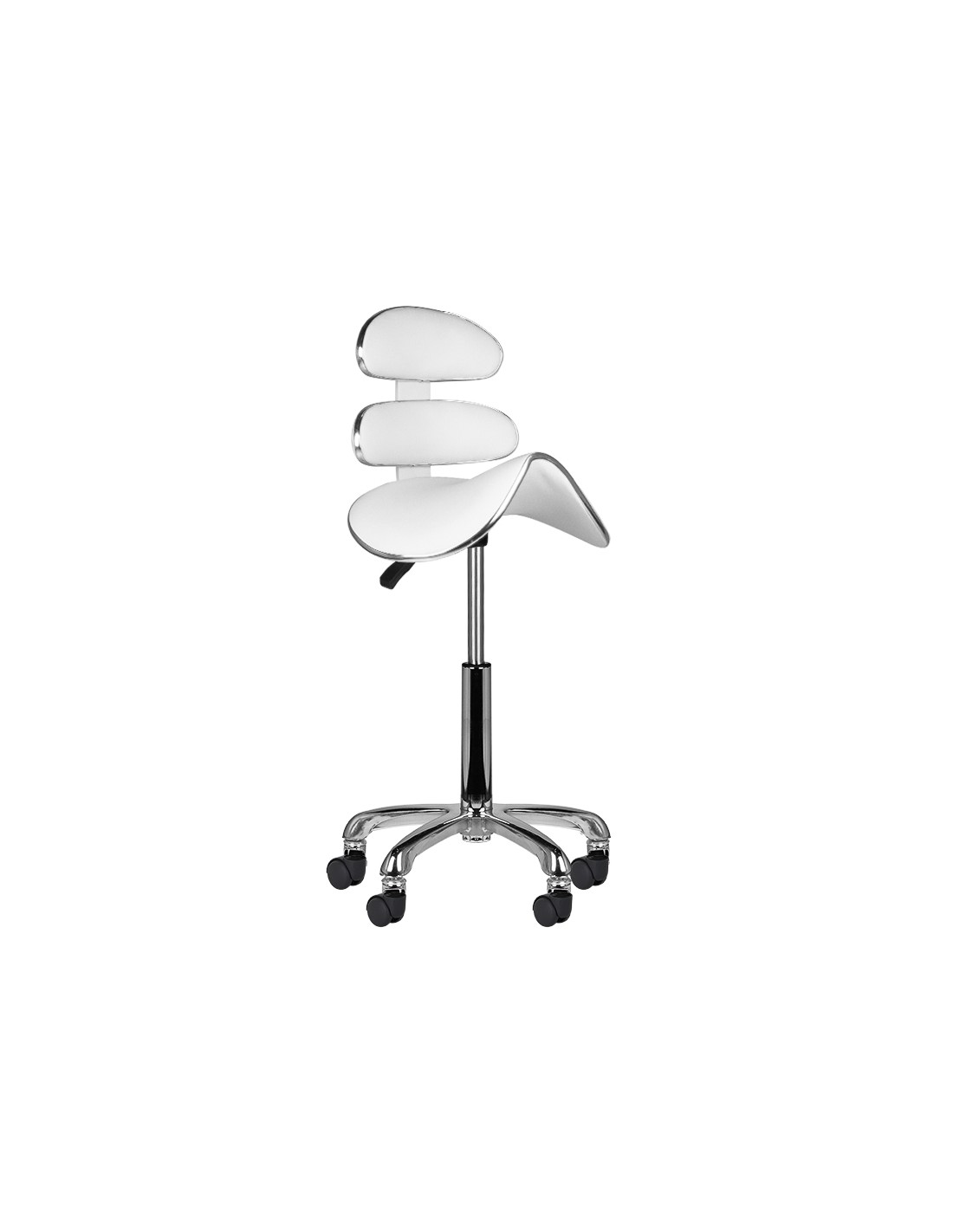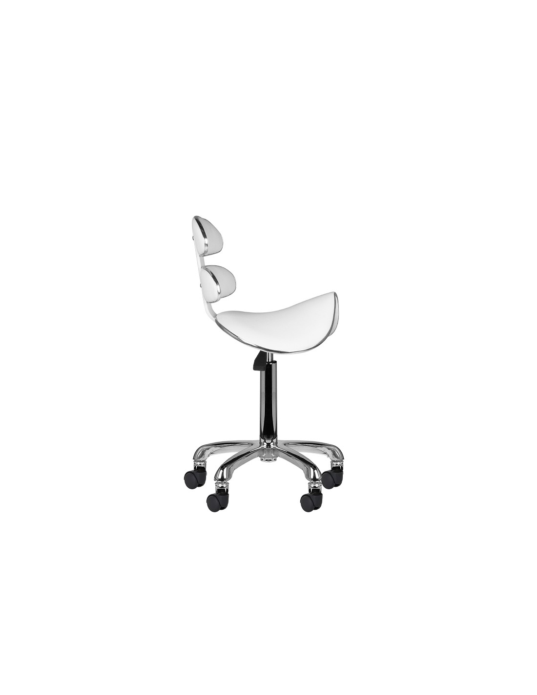 Sgabello cosmetico comodo e stabile con sedile sagomato e schienale ergonomico. Poggia su una base a cinque stelle con le sensazionali rotelle in plastica Roll Speed, che garantiscono leggerezza nei movimenti. Realizzato in ecopelle bianca.