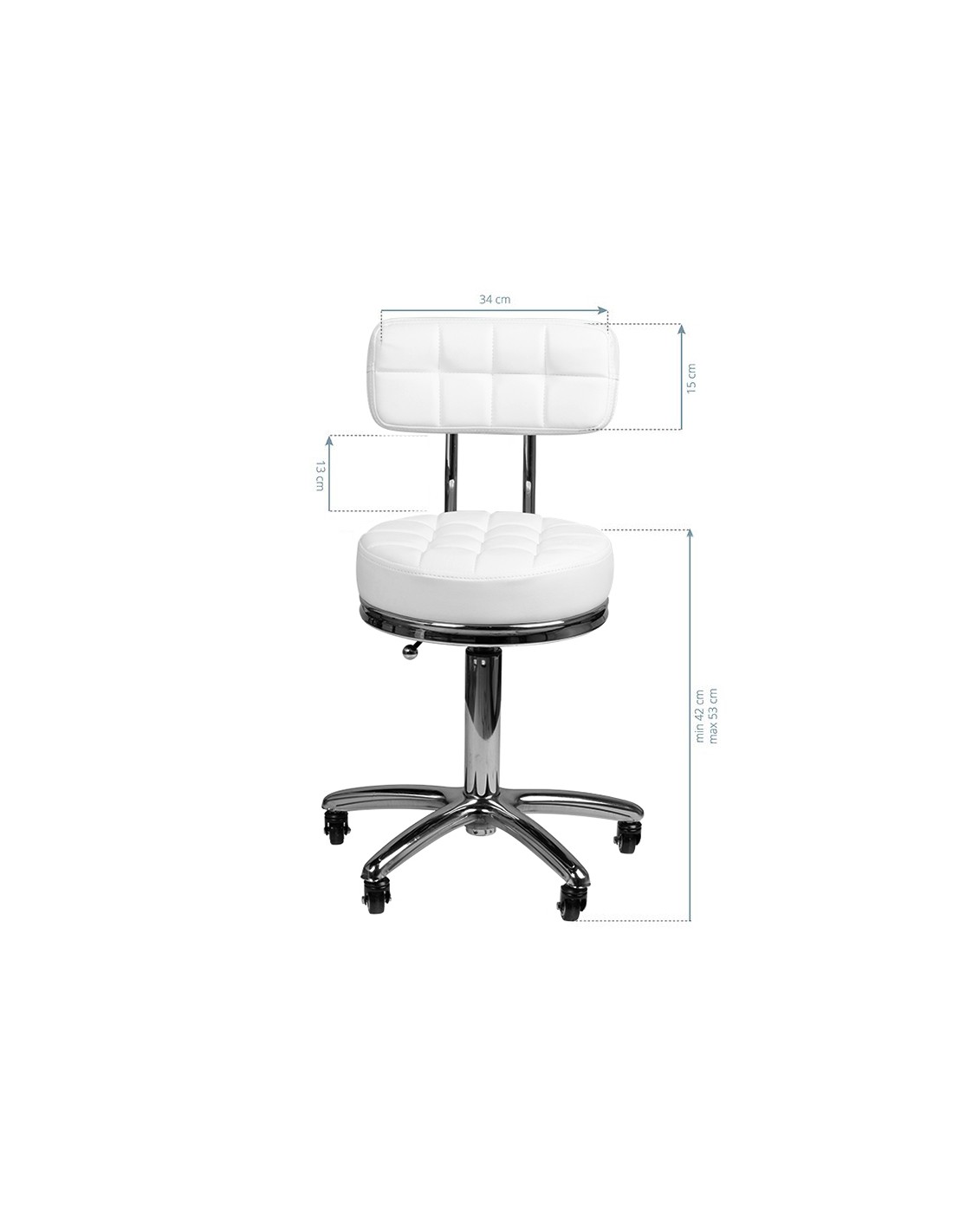 Sgabello cosmetico di colore bianco con seduta trapuntata e comodo schienale. È regolabile in altezza e ha una base a trampolo dotata di robuste rotelle in metallo-gomma.
