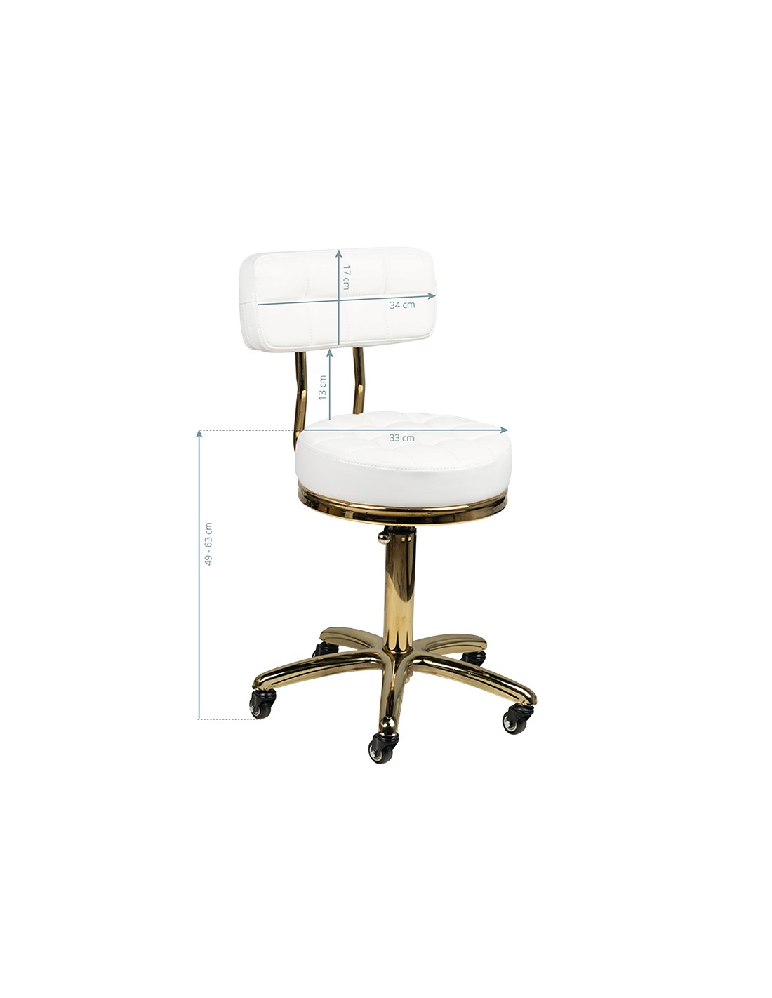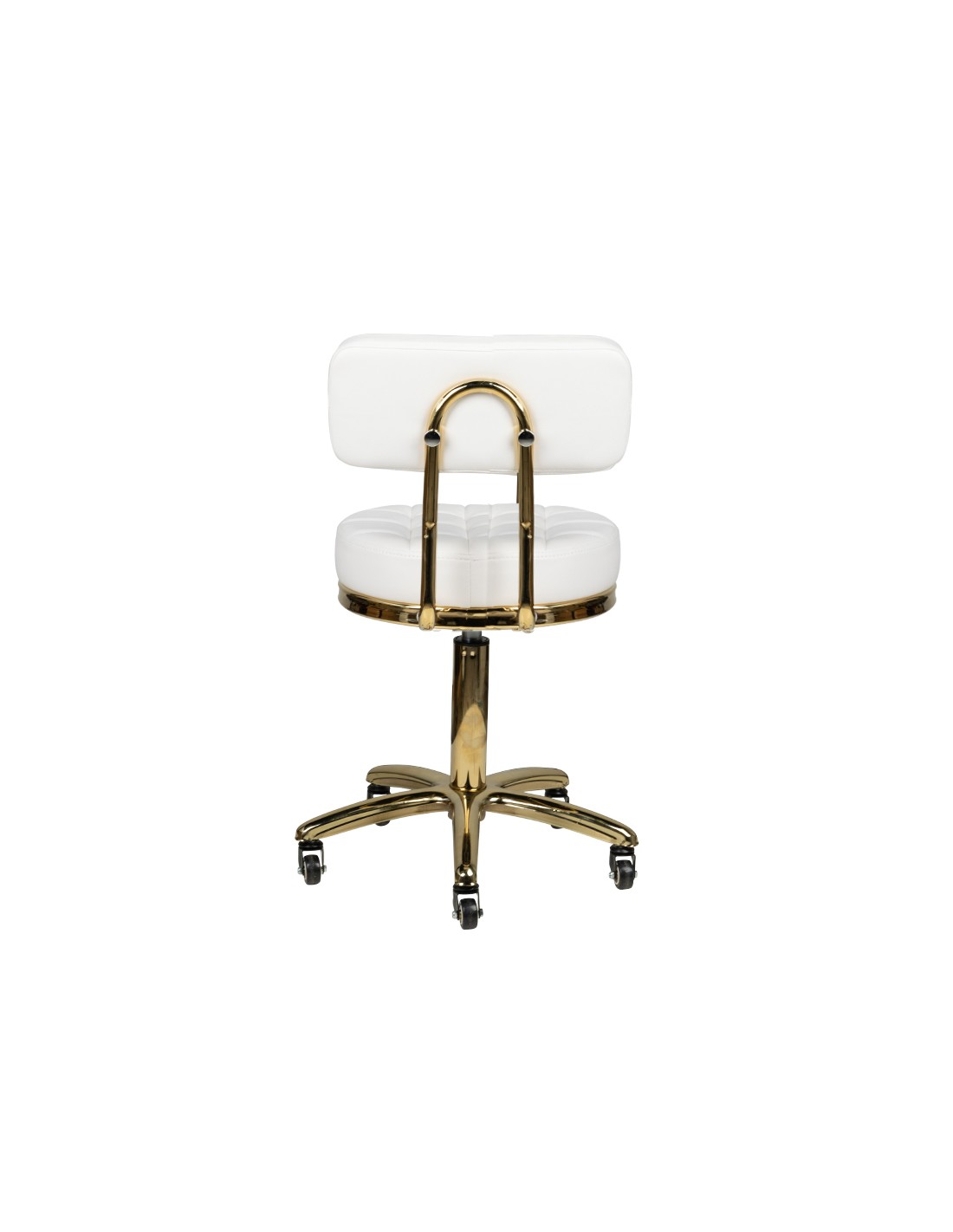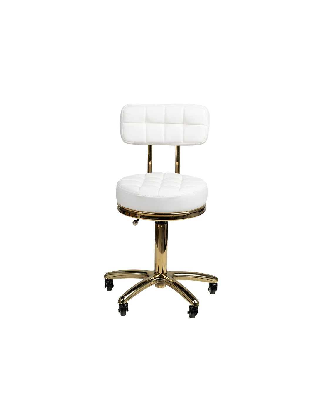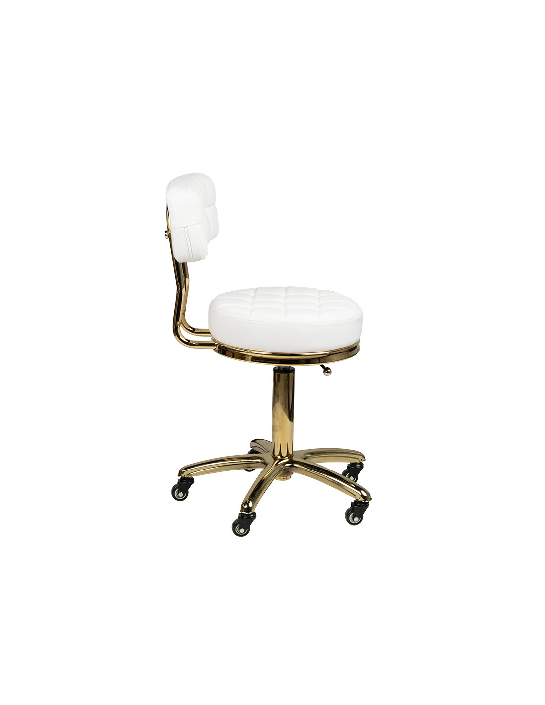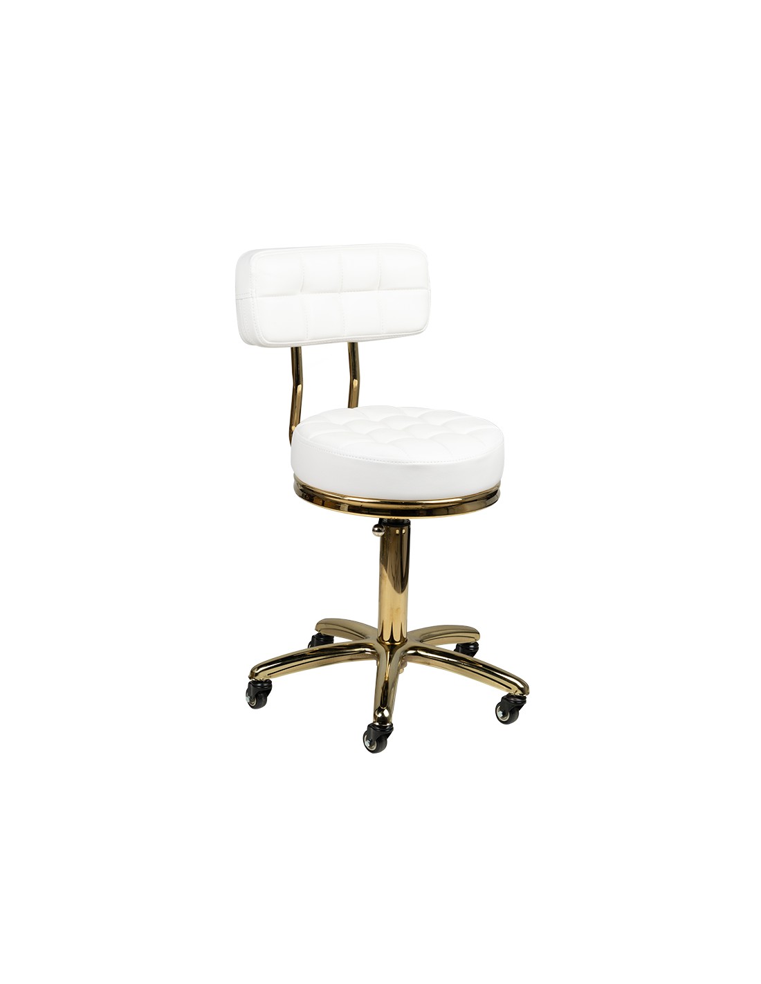 Uno sgabello cosmetico unico in bianco con seduta trapuntata e comodo schienale. Gli elementi metallici brillano splendidamente in oro. È regolabile in altezza e ha una robusta base in metallo-gomma con solide rotelle. Superfici metalliche laccate.