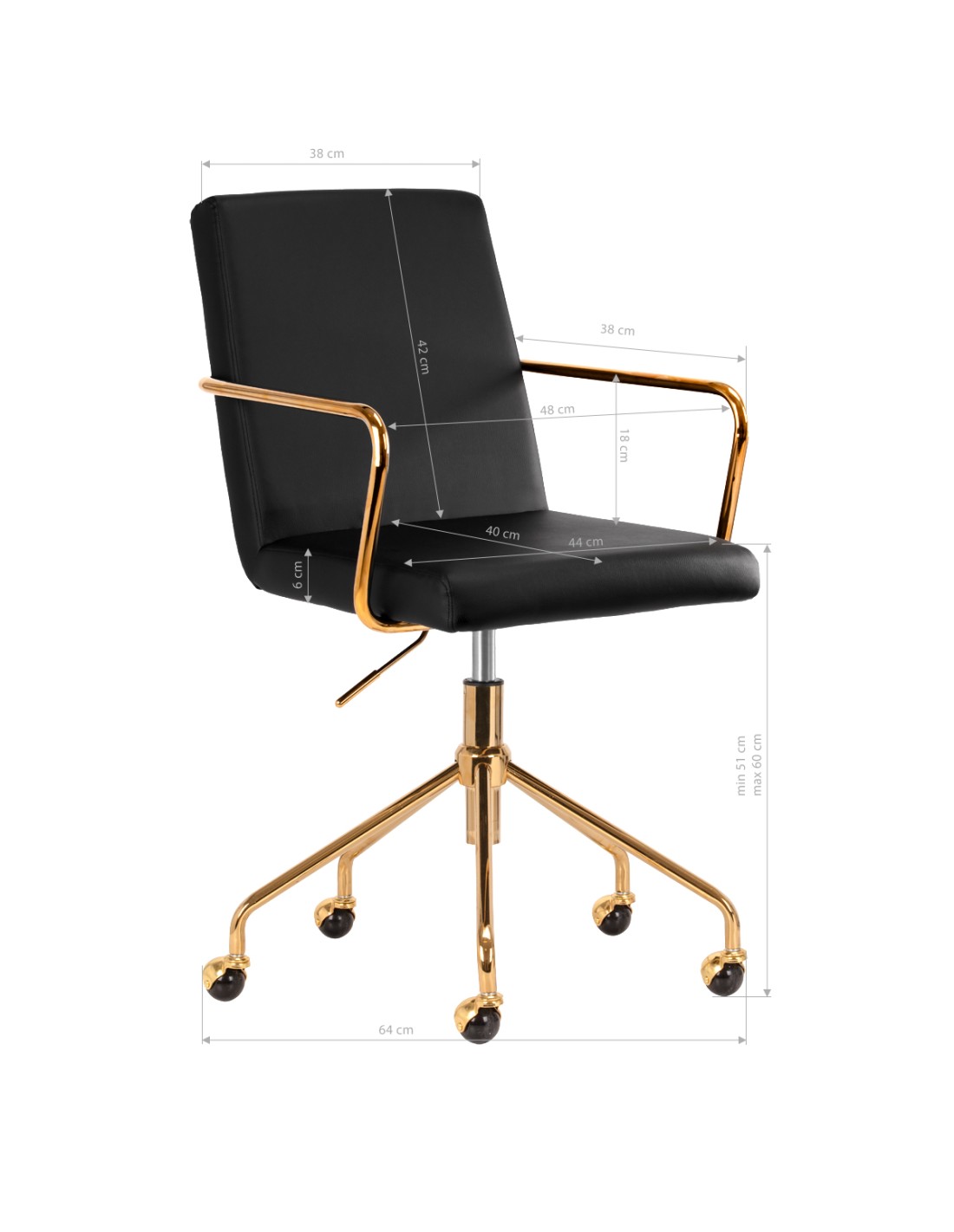 Piacevole al tatto, il rivestimento in pelle sintetica nei toni del nero conferisce al mobile un carattere unico. L'elegante finitura lo rende un vero e proprio richiamo visivo. La struttura color oro aggiunge eleganza, integrandosi perfettamente con le forme semplici. Le rotelle funzionali garantiscono una notevole mobilità, facilitando lo spostamento della sedia e gli spostamenti in salotto durante il lavoro. L'estetica della lavorazione, il comfort d'uso e lo schienale ergonomico fanno sì che la sedia soddisfi le richieste anche degli utenti più esigenti.