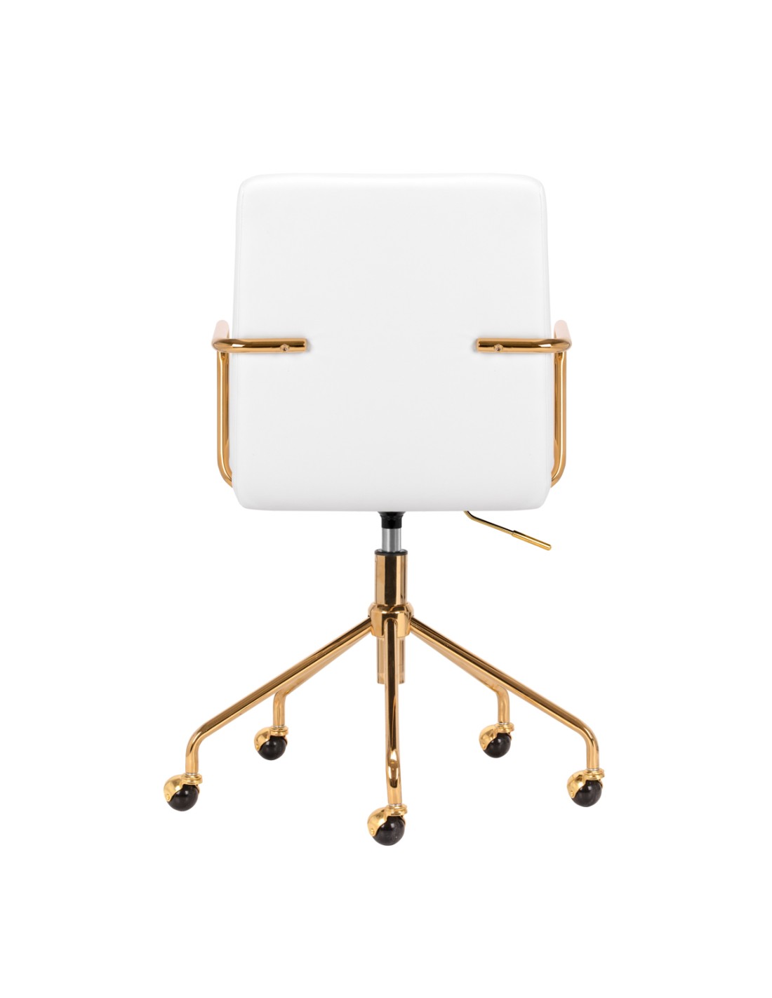 Piacevole al tatto, il rivestimento in pelle sintetica nei toni del bianco conferisce al mobile un carattere unico. L'elegante finitura lo rende un vero e proprio richiamo visivo. La struttura color oro aggiunge eleganza, integrandosi perfettamente con le forme semplici. Le rotelle funzionali garantiscono una notevole mobilità, facilitando lo spostamento della sedia e gli spostamenti in salotto durante il lavoro. L'estetica della lavorazione, il comfort d'uso e lo schienale ergonomico fanno sì che la sedia soddisfi le richieste anche degli utenti più esigenti.
