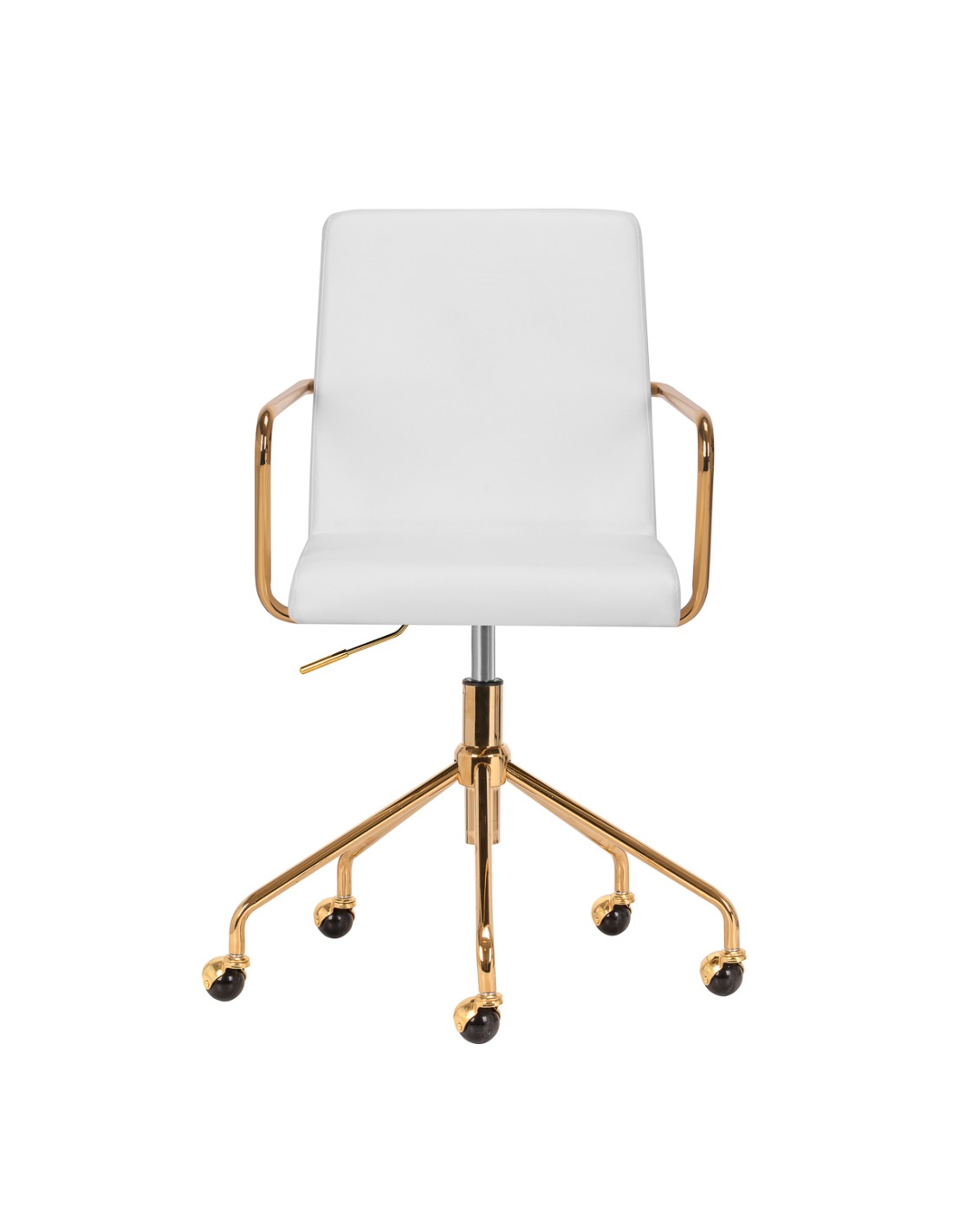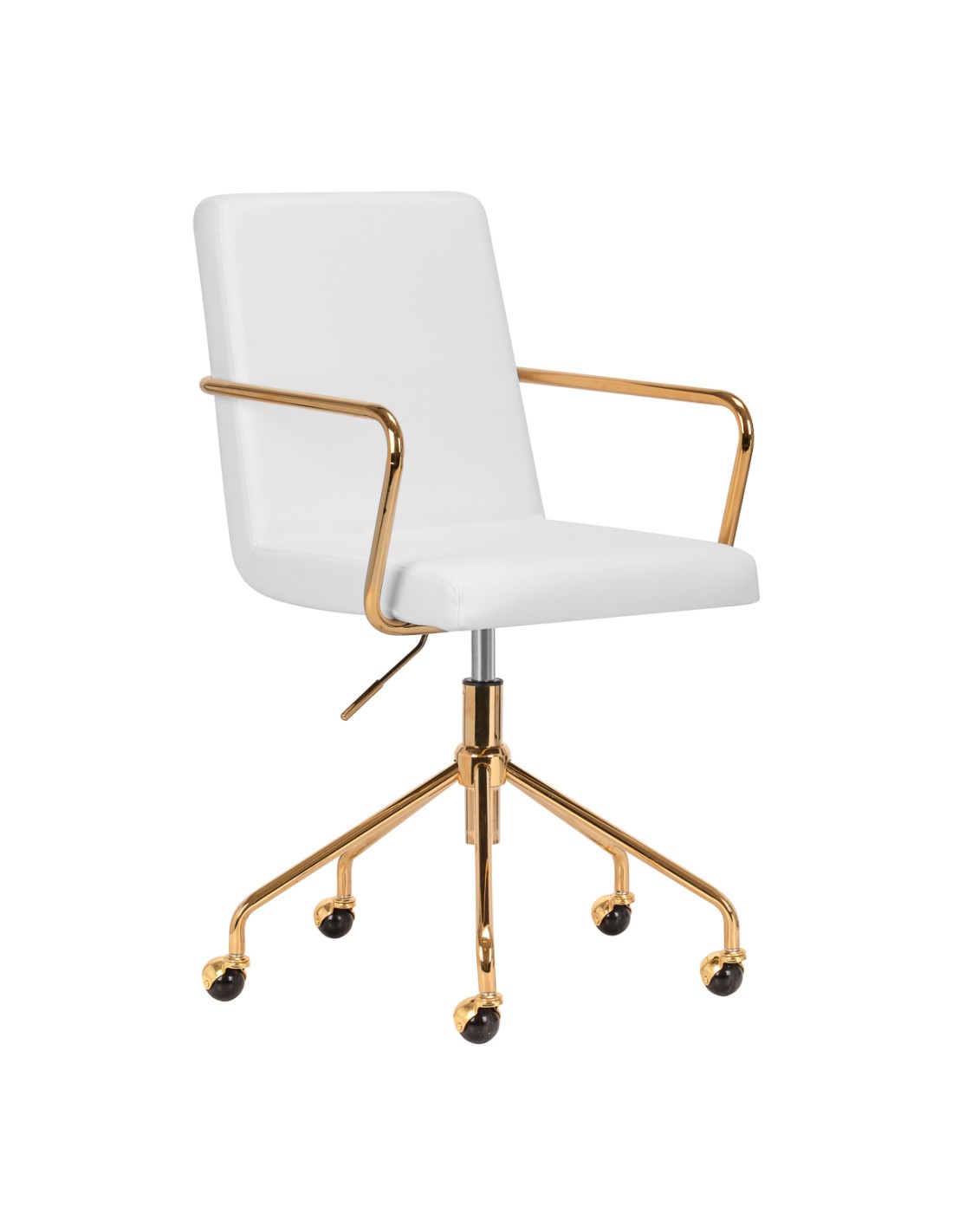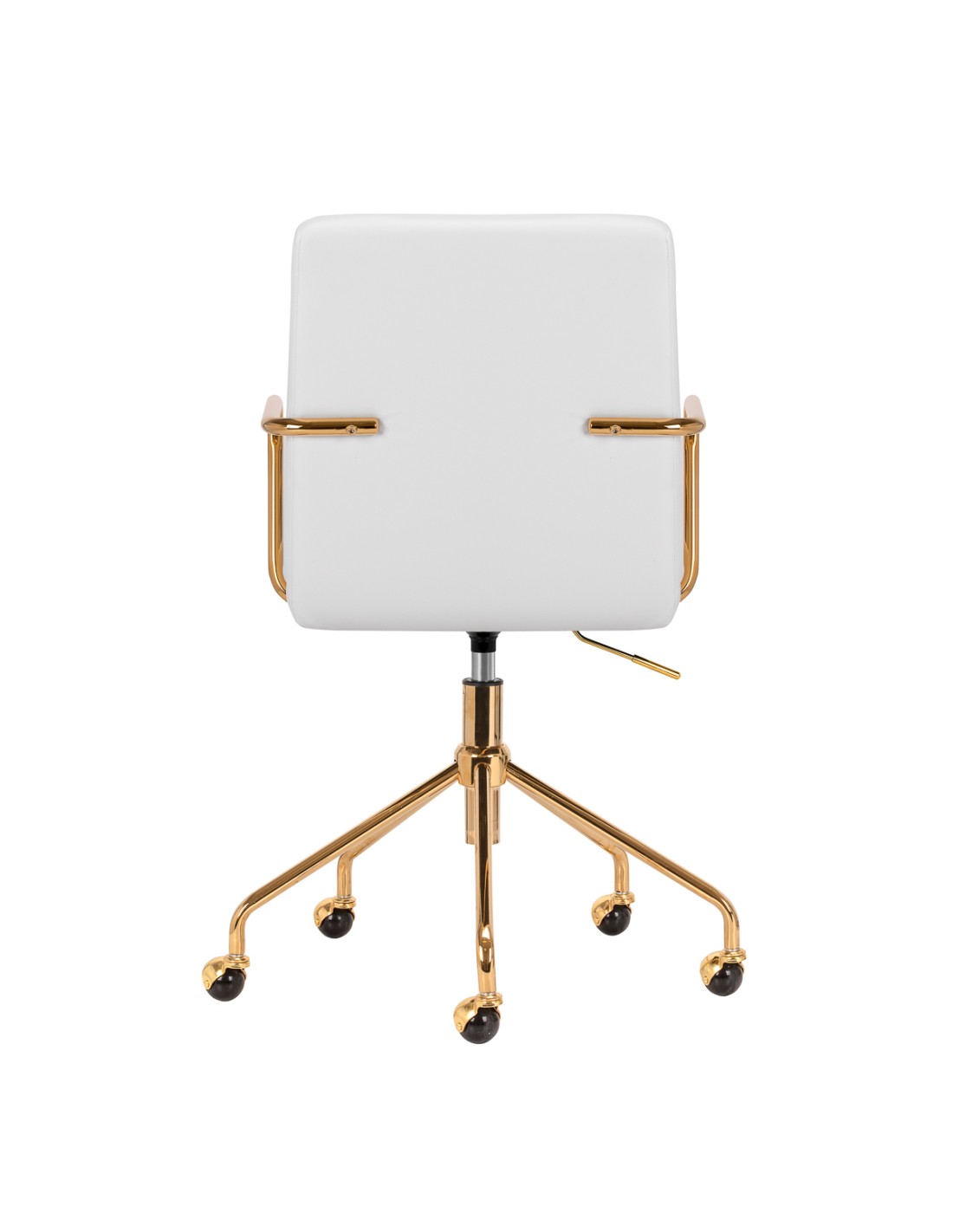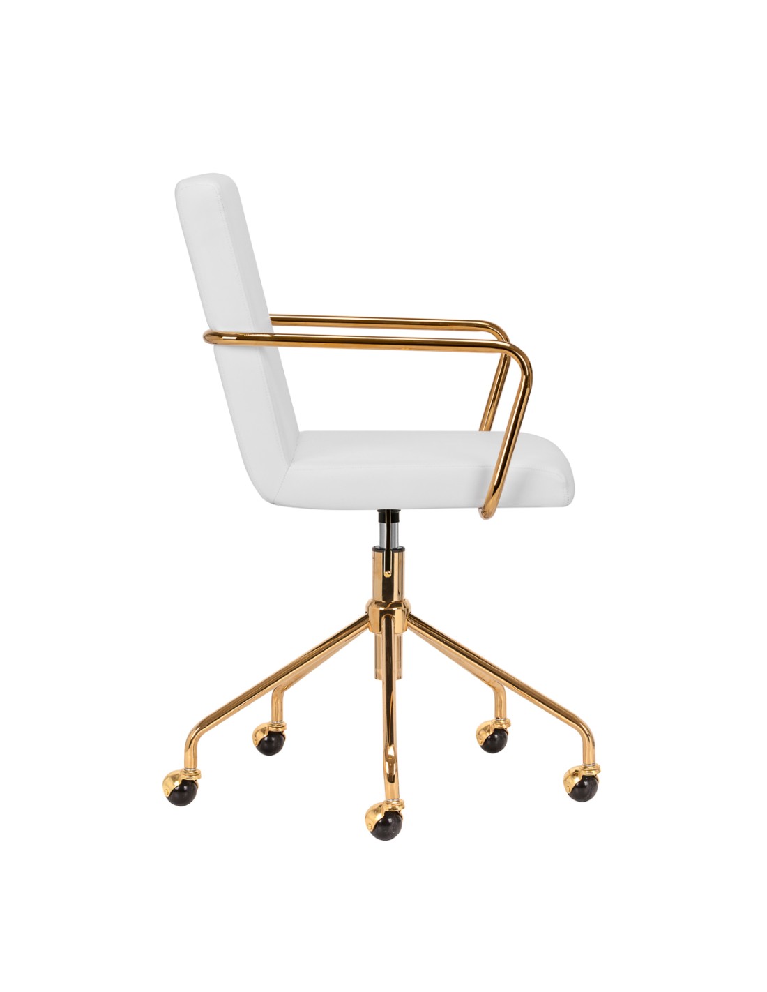 Il rivestimento in pelle sinteticapiacevole al tatto nei toni del grigio conferisce al mobile un carattere unico. L'elegante finitura lo rende un vero e proprio richiamo visivo. La struttura color oro aggiunge eleganza, integrandosi perfettamente con le forme semplici. Le rotelle funzionali garantiscono una notevole mobilità, facilitando lo spostamento della sedia e gli spostamenti in salotto durante il lavoro. L'estetica della lavorazione, il comfort d'uso e lo schienale ergonomico fanno sì che la sedia soddisfi le richieste anche degli utenti più esigenti.
