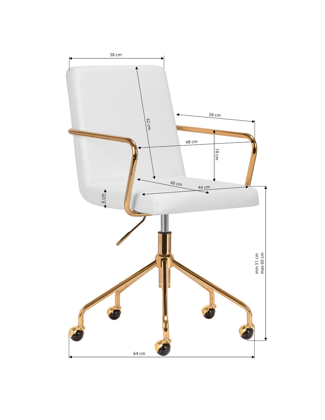 Un'efficiente elevazione a gas consente di regolare l'altezza della seduta in modo semplice e agevole tra 51 e 60 cm. Ciò consente di adattare il mobile alle esigenze individuali e ai servizi da svolgere, garantendo un elevato livello di comfort, sia per il trucco che per lo styling delle sopracciglia o altre attività. Il meccanismo di rotazione completa migliora l'efficienza del lavoro e il comfort. I braccioli in metallo sono all'altezza giusta e consentono un corretto posizionamento delle spalle.