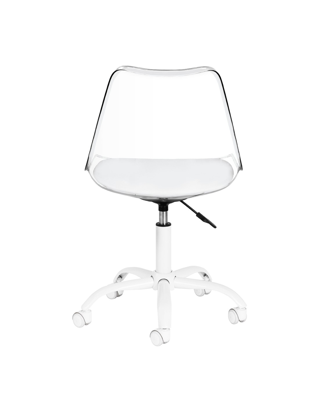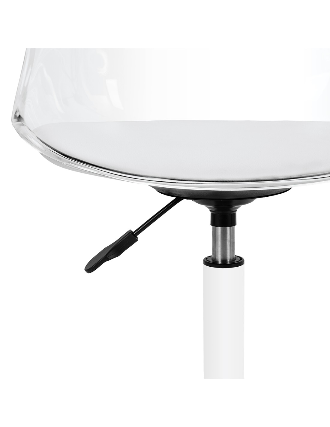 Il modello cattura l'attenzione con il suo schienale trasparente, che conferisce all'insieme un carattere leggero e moderno. La combinazione della struttura trasparente con il cuscino della seduta rivestito in pelle sintetica bianca e la base bianca crea un contrasto sofisticato che sottolinea l'eleganza. Questo rende la sedia non solo un mobile funzionale, ma anche un'elegante decorazione per l'ufficio. Si integra perfettamente con qualsiasi interno, adattandosi perfettamente all'estetica dei saloni di bellezza contemporanei.