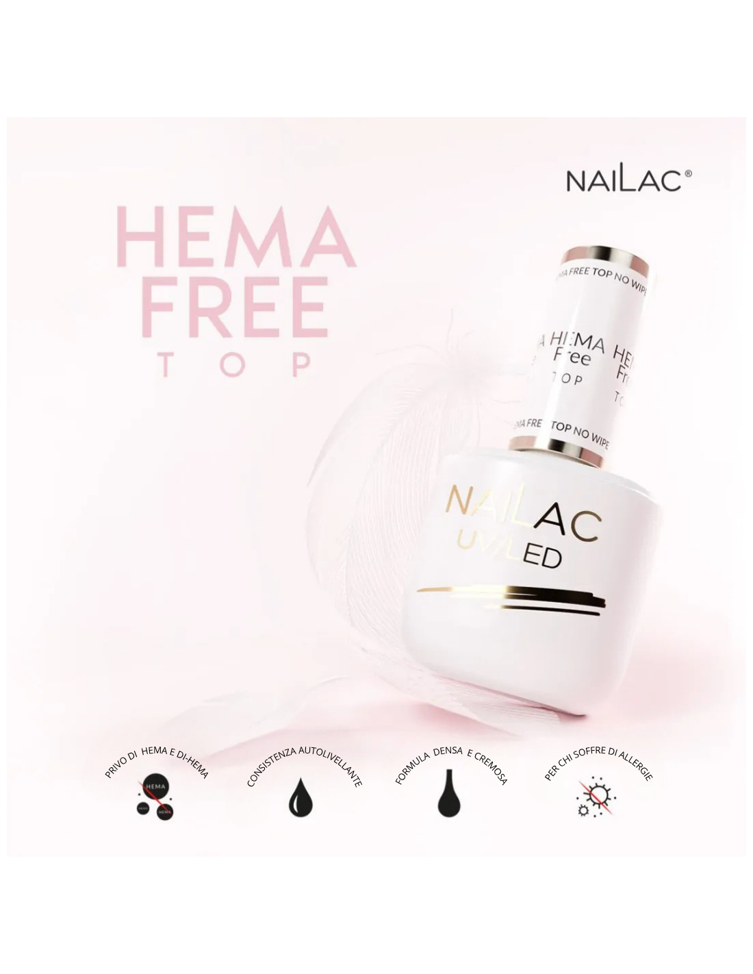 Finish per unghie HEMA Free No Wipe NaiLac dedicato a lucidare e sigillare gli smalti semipermanenti / ibridi senza ingredienti HEMA e Di-Hema, riduce al minimo l'eventali insorgere di irritazioni della pelle.