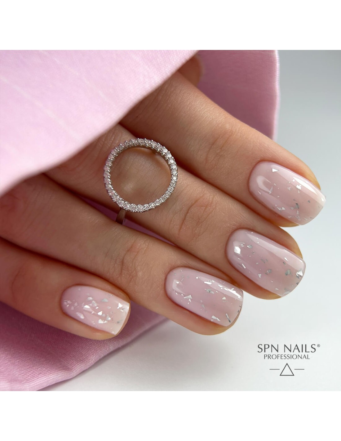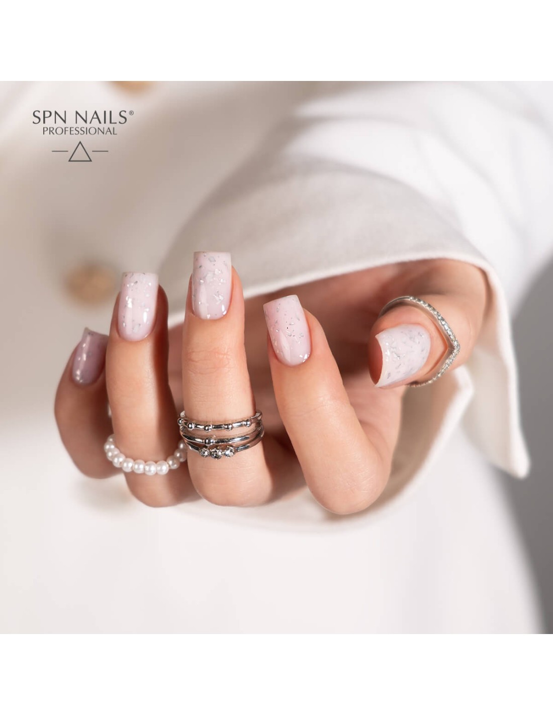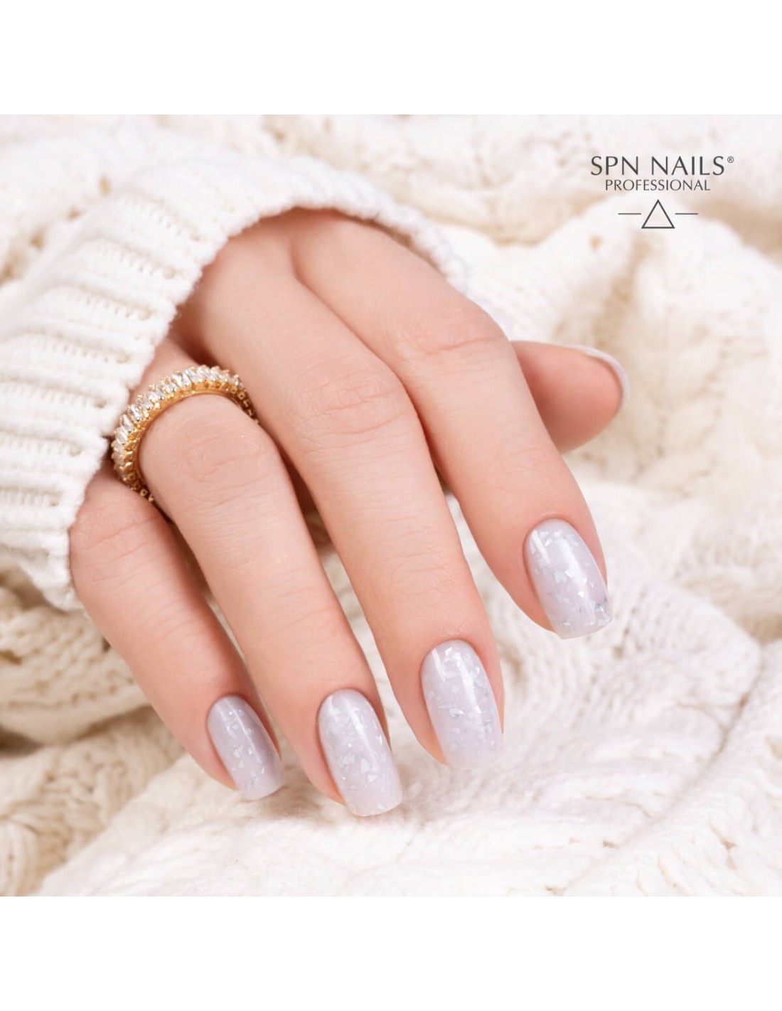 Questa tonalità lattiginosa non è il solito bianco: è arricchita da sottili frammenti di foglia d’argento che catturano la luce a ogni movimento, regalando un effetto "wow" ma estremamente discreto.