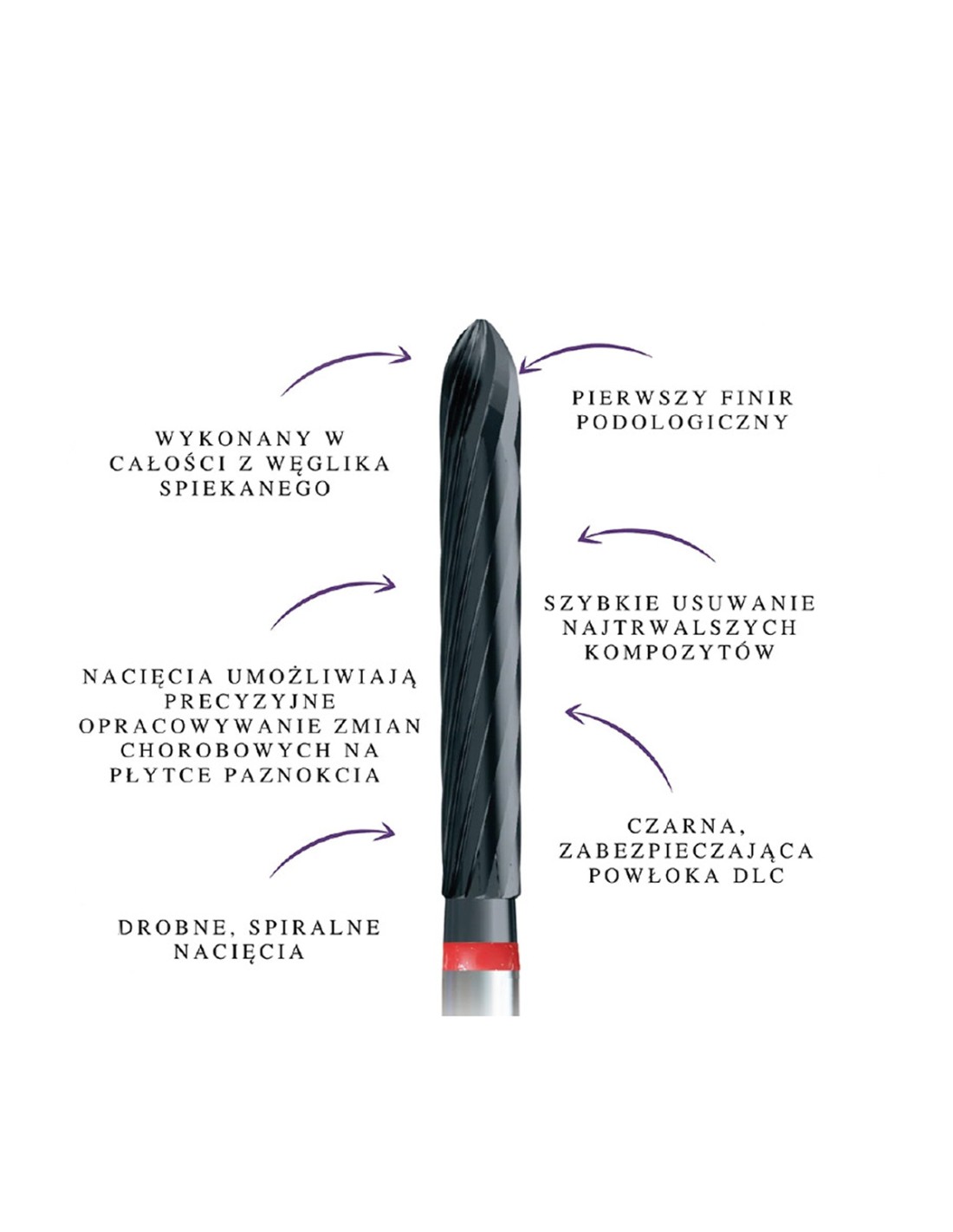 La fresa podologica Finir di Famous Podiatrist, con le sue sottili incisioni a spirale e la particolare angolazione delle incisioni, consente di rimuovere entrambi i materiali podologici. La densità appropriata delle incisioni consente di lavorare in modo uniforme ed efficace sul materiale podologico. Lo strumento è realizzato interamente in carburo di tungsteno per garantire un lavoro sicuro e controllato. Inoltre, l'affilatura e la profondità delle incisioni consentono di lavorare in modo rapido e preciso sia sulla superficie del materiale che sulle lesioni della lamina ungueale. La punta è stata trattata con uno speciale rivestimento DLC "Diamond Like Carbon", estremamente duro, resistente all'usura e alla corrosione e, soprattutto, in grado di funzionare molto bene ad alta velocità.