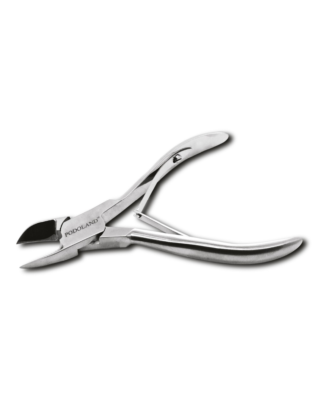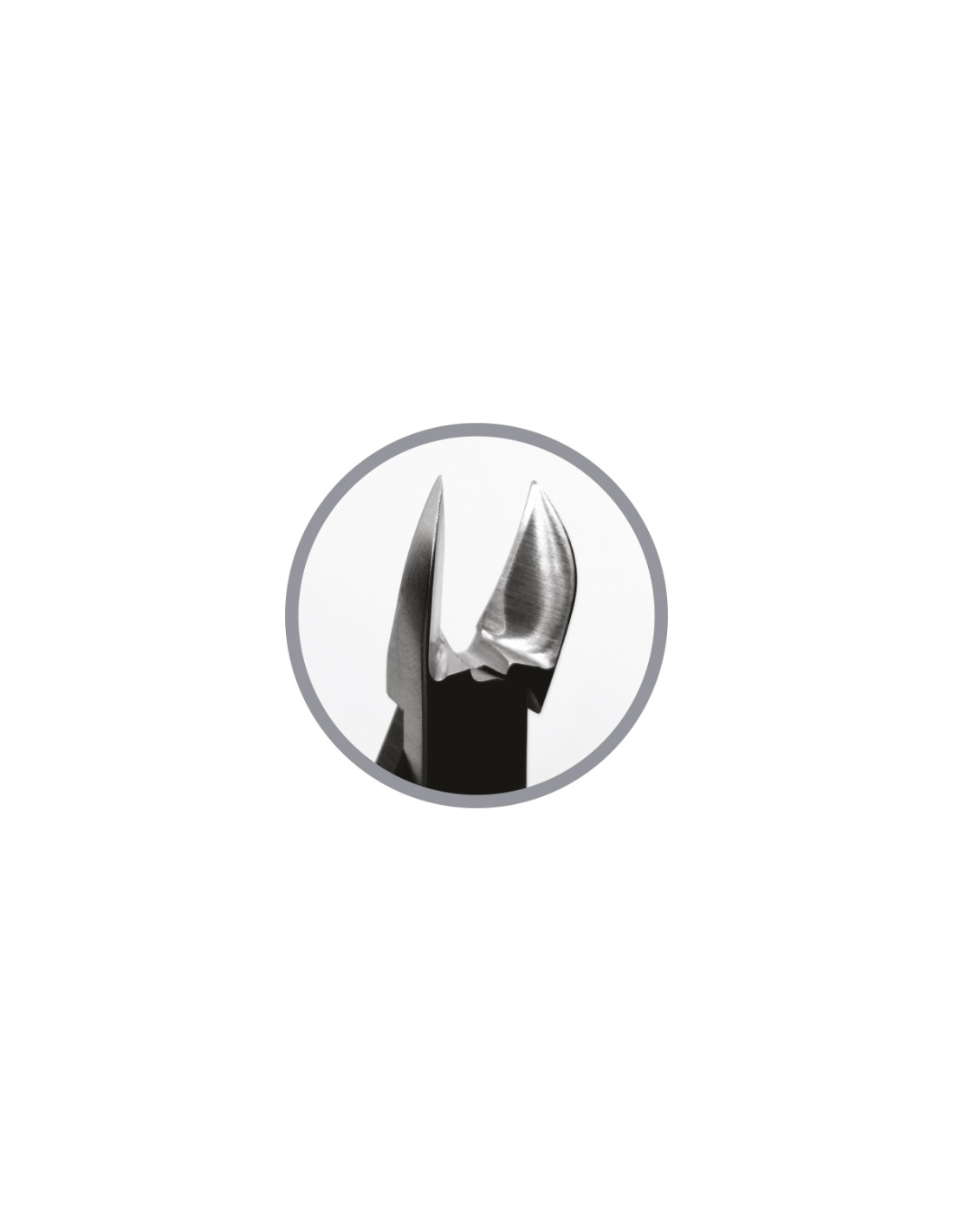 La pinza con lama curva (laterale) è realizzata in acciaio inossidabile di altissima qualità. È uno strumento robusto e preciso con una superficie di taglio affilata (1,6 cm). Lo speciale design della lama rende la pinza eccellente per accorciare i chiodi semicircolari. Il modello è dotato di un meccanismo di sicurezza a doppia molla. L'utensile può essere sterilizzato in autoclave. Le pinze sono particolarmente indicate per l'uso in chirurgia estetica e podologica.