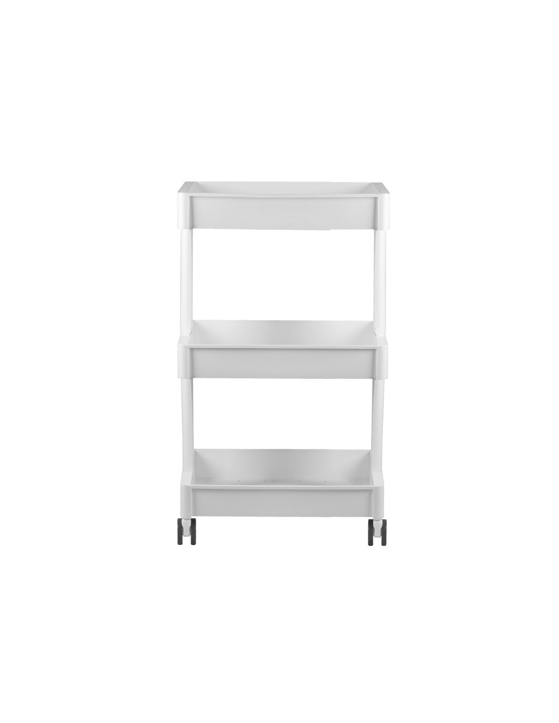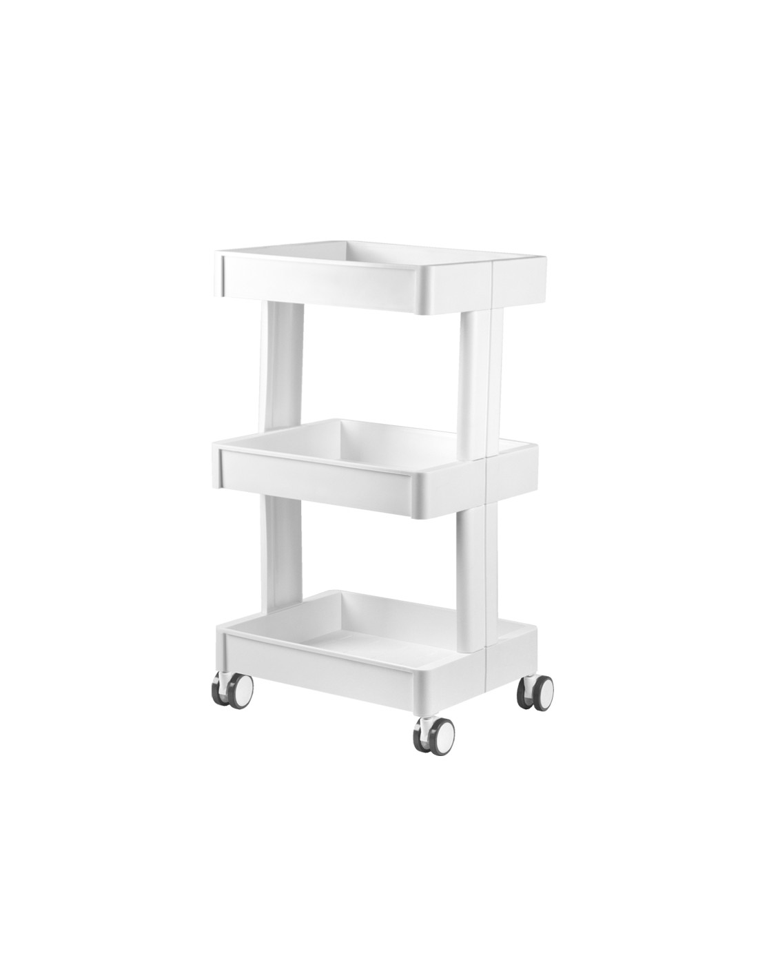 Funzionale tavolo in plastica con ruote in gomma. Il tavolo è dotato di tre ripiani con una ringhiera per evitare che il contenuto cada.