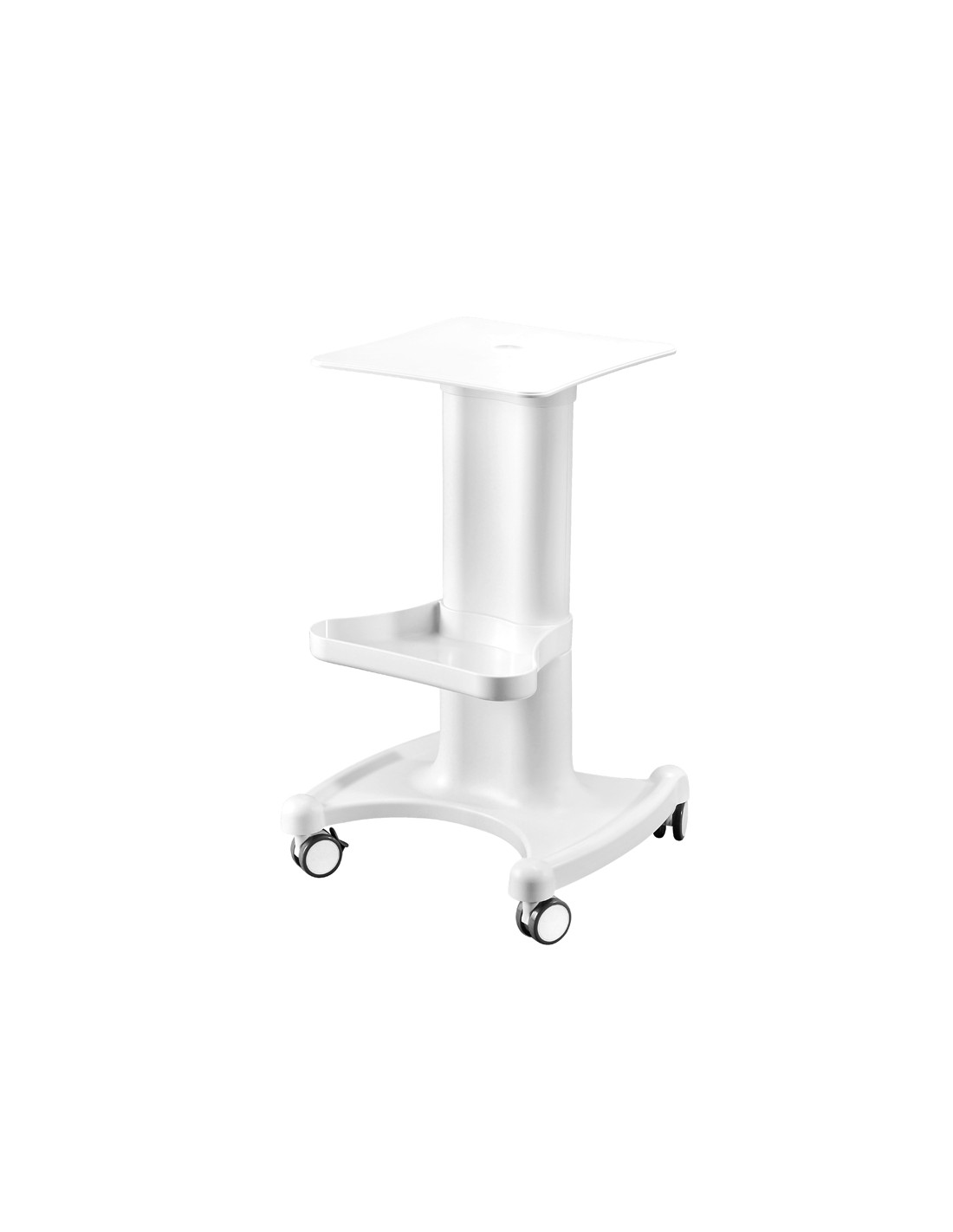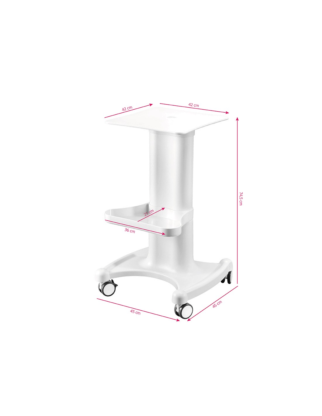 Tavolo funzionale in plastica con rotelle in gomma con funzione di bloccaggio. Ideale come tavolo per un dispositivo cosmetico. È dotato di due ripiani, uno per il dispositivo e l'altro per gli accessori. Il mobile offre comodità e comfort durante il lavoro.