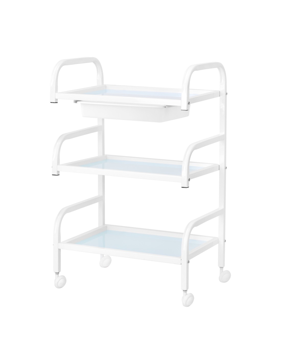 L'assistente cosmetico Basic 121 è un mobile funzionale, perfetto per qualsiasi salone cosmetico o spa. La struttura leggera facilita il lavoro quotidiano, mentre i tre ripiani in vetro consentono di riporre comodamente cosmetici, accessori e attrezzature. Un vassoio aggiuntivo sotto il ripiano superiore consente di accedere rapidamente agli strumenti utilizzati più di frequente. Il design minimalista aggiunge un tocco professionale agli interni.