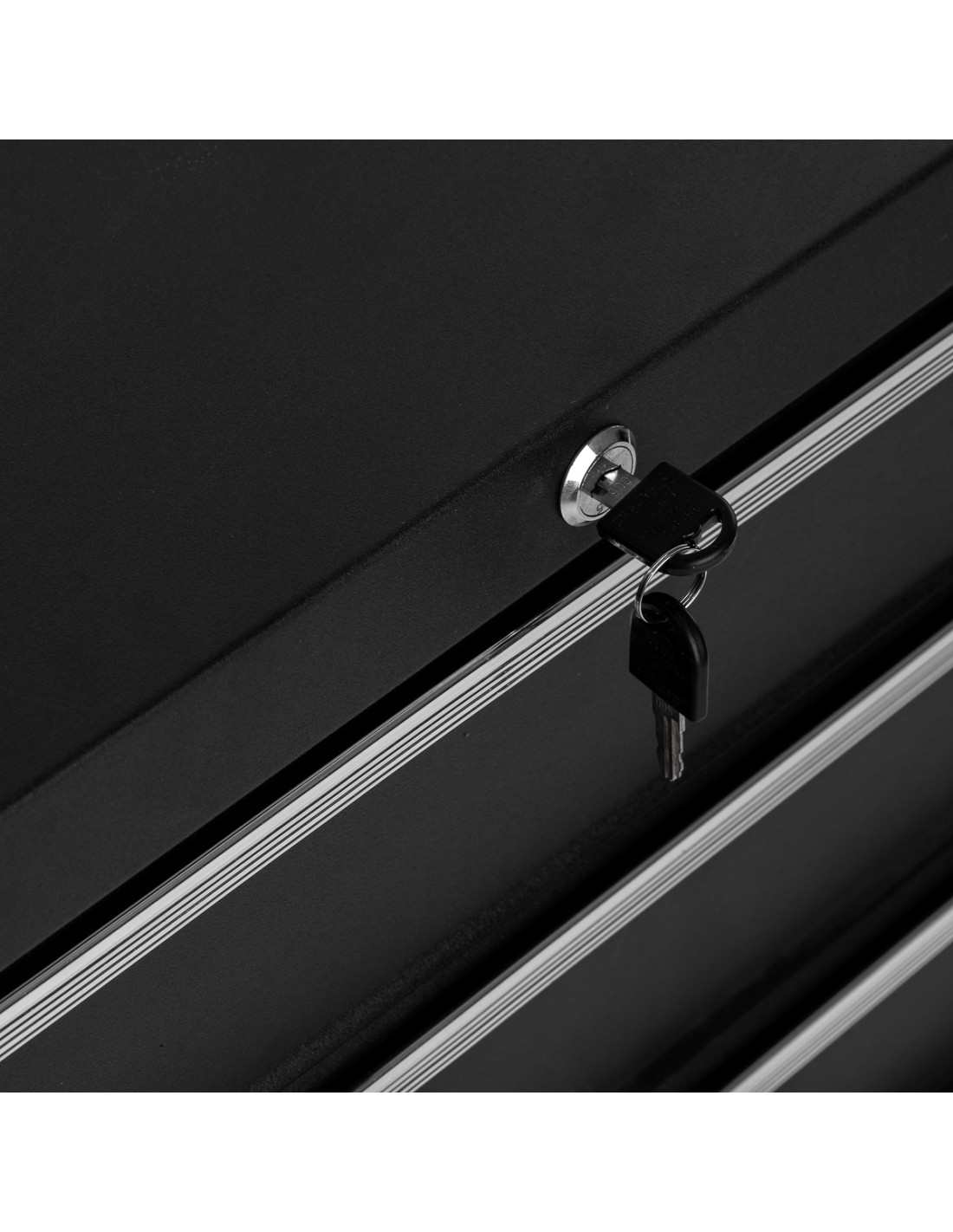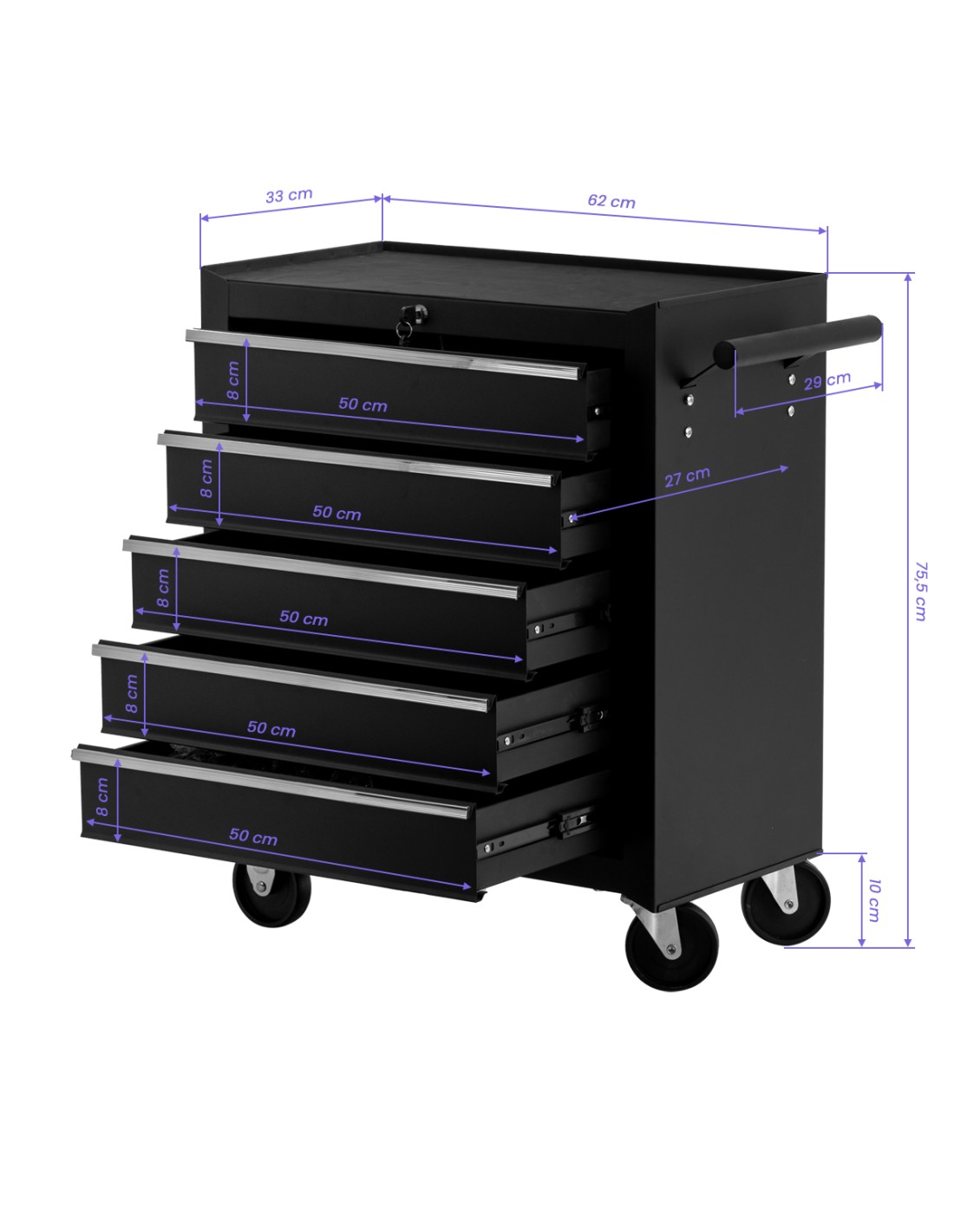 Quattro ruote in plastica nera, di cui una coppia con sistema di bloccaggio, assicurano una guida fluida e un posizionamento stabile dell'assistente. La maniglia laterale consente di manovrare il mobile con precisione. La chiusura a chiave impedisce che i cassetti si estraggano da soli e consente di riporre le attrezzature più delicate, la documentazione o i materiali che richiedono una cura particolare.