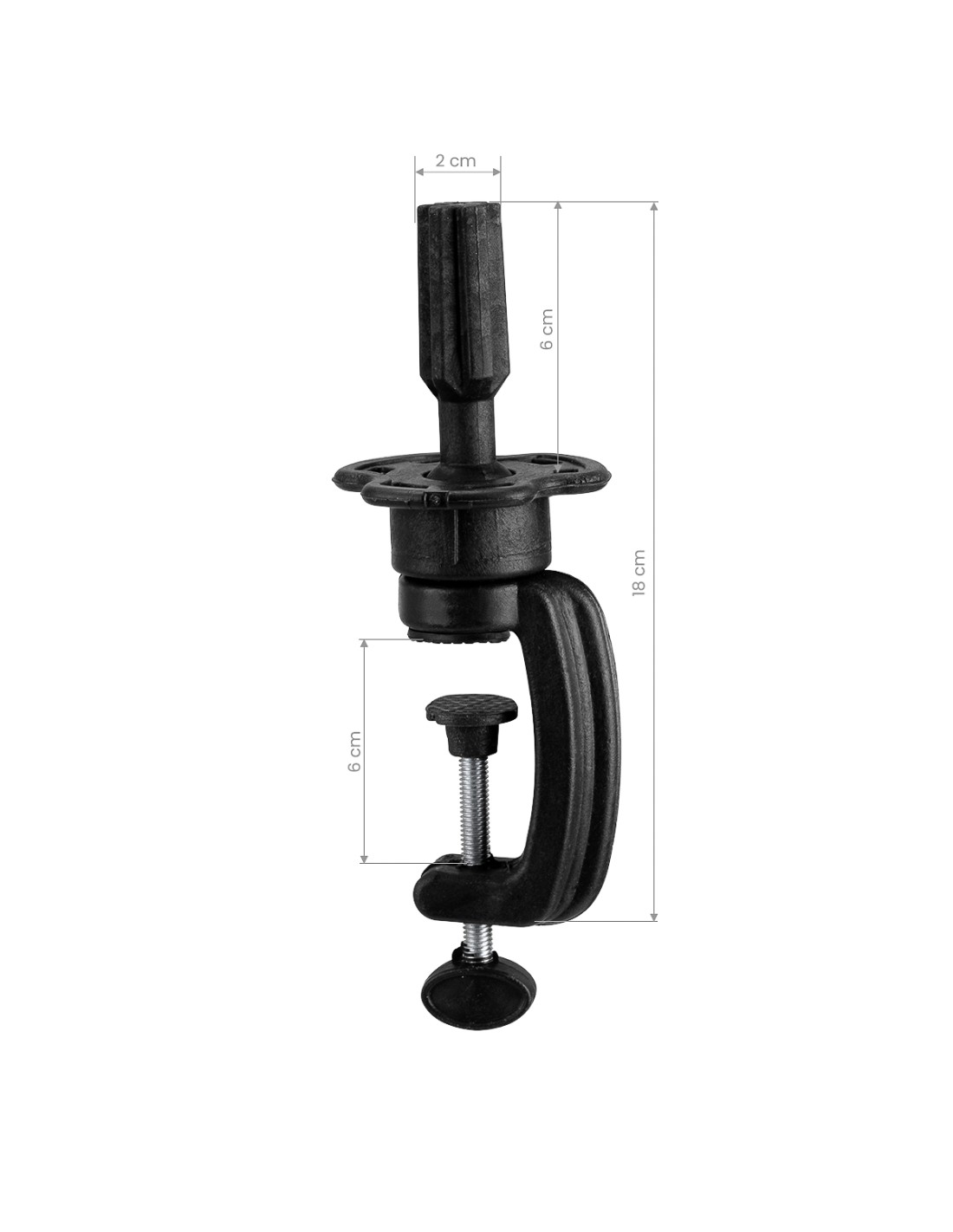 Ildesign minimalista del treppiede lo rende perfettamente integrabile nell'arredamento di qualsiasi salone di parrucchieri o spazio di formazione. La struttura leggera ma robusta, realizzata in plastica resistente, assicura mobilità, durata e resistenza ai danni meccanici. I materiali di alta qualità utilizzati nella produzione garantiscono un uso duraturo, mentre il design ergonomico aumenta il comfort di lavoro. Il treppiede è dotato di una maniglia che funziona secondo il principio della morsa con un'apertura massima di 4,5 cm, che consente un fissaggio facile e stabile alla maggior parte dei piani di lavoro.