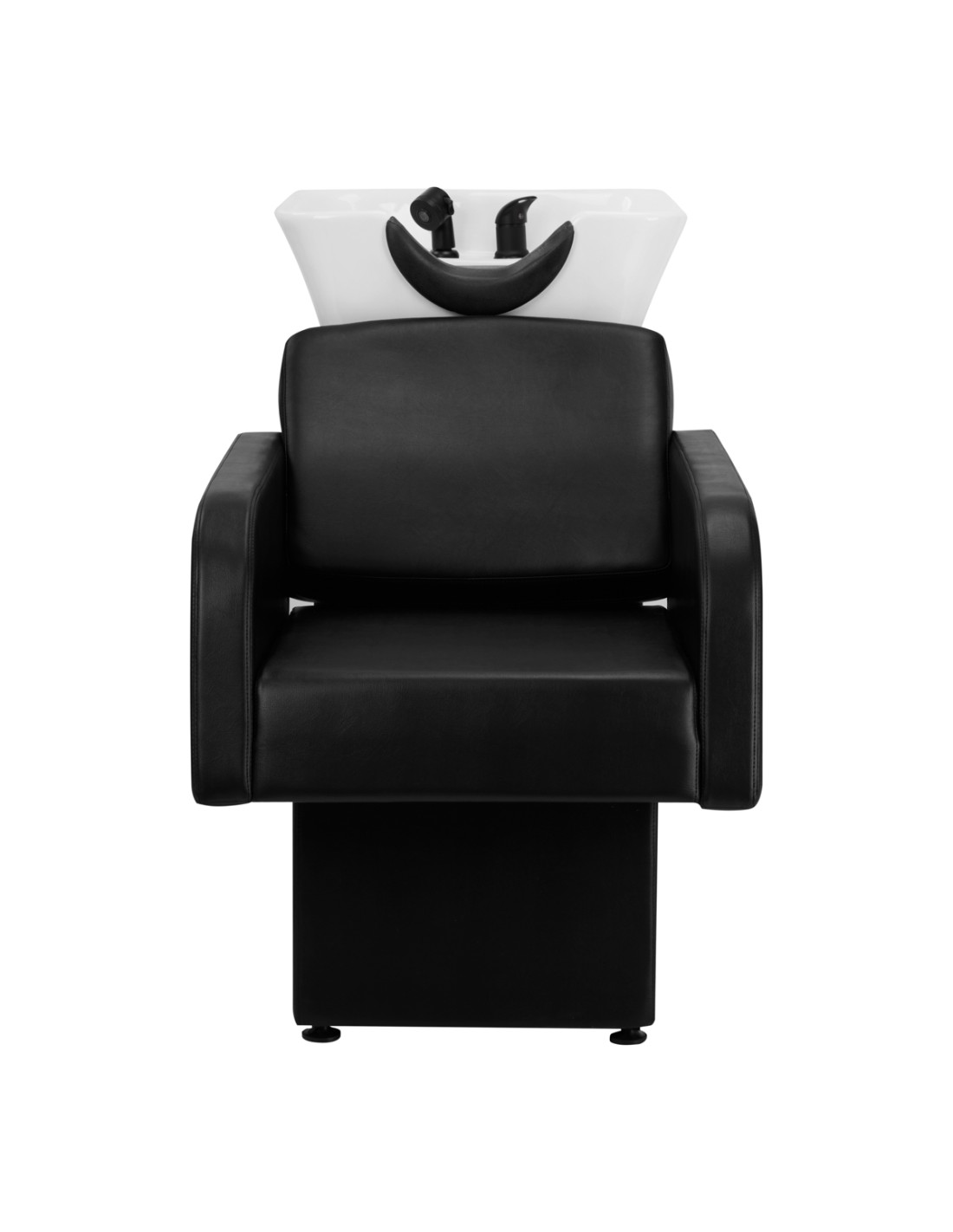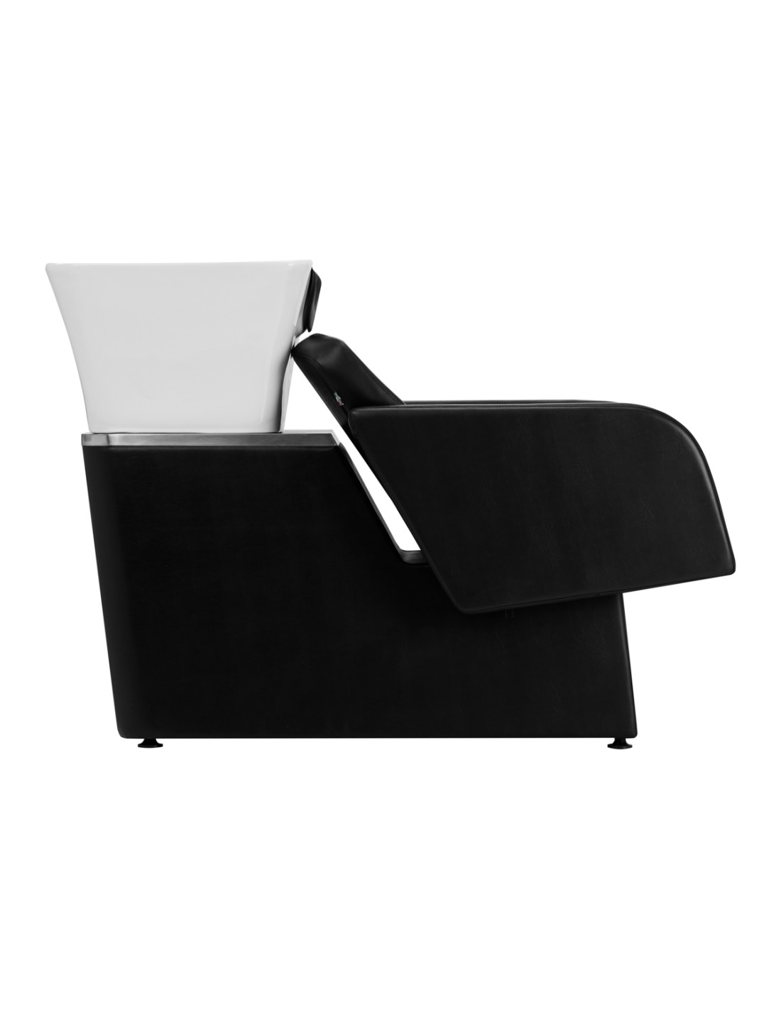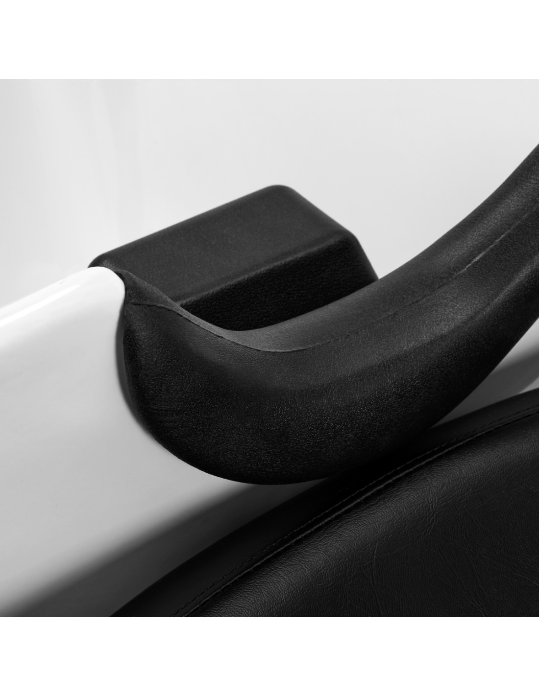 L'accattivante lavabo in ceramica bianca , con la sua forma interessante e la profondità adeguata, evita schizzi eccessivi di acqua o di prodotti utilizzati durante il trattamento. Ciò consente di eseguire un'ampia gamma di servizi in modo comodo ed efficiente. Il materiale di alta qualità utilizzato rende il lavabo durevole, resistente alle macchie e ai graffi e molto facile da pulire. La flangia opportunamente sagomata e lo schienale inclinato offrono sostegno e comfort durante il lavaggio dei capelli e, grazie al comodo rivestimento in plastica nei toni del nero, il cliente non si sentirà a disagio per la freddezza della superficie in ceramica.