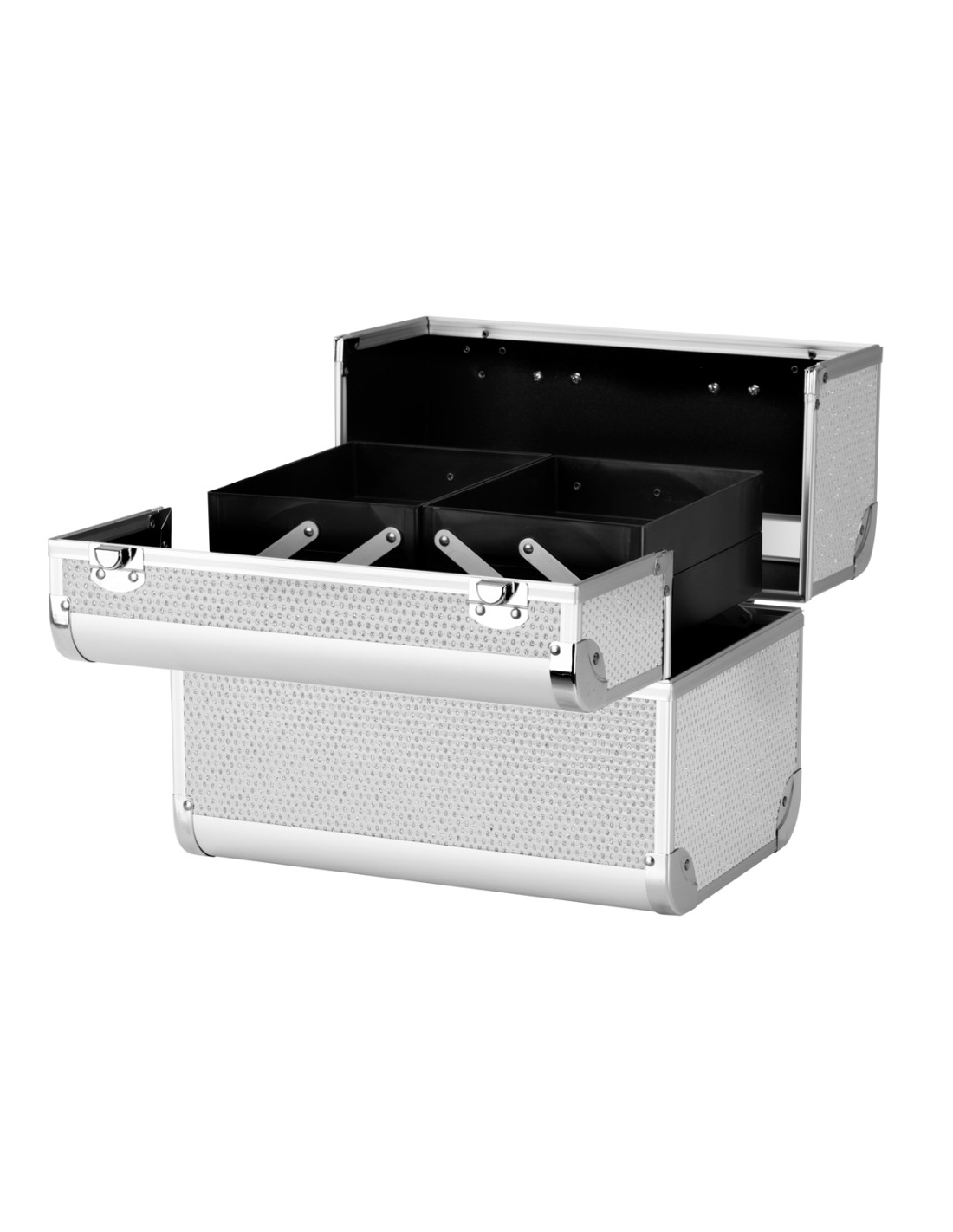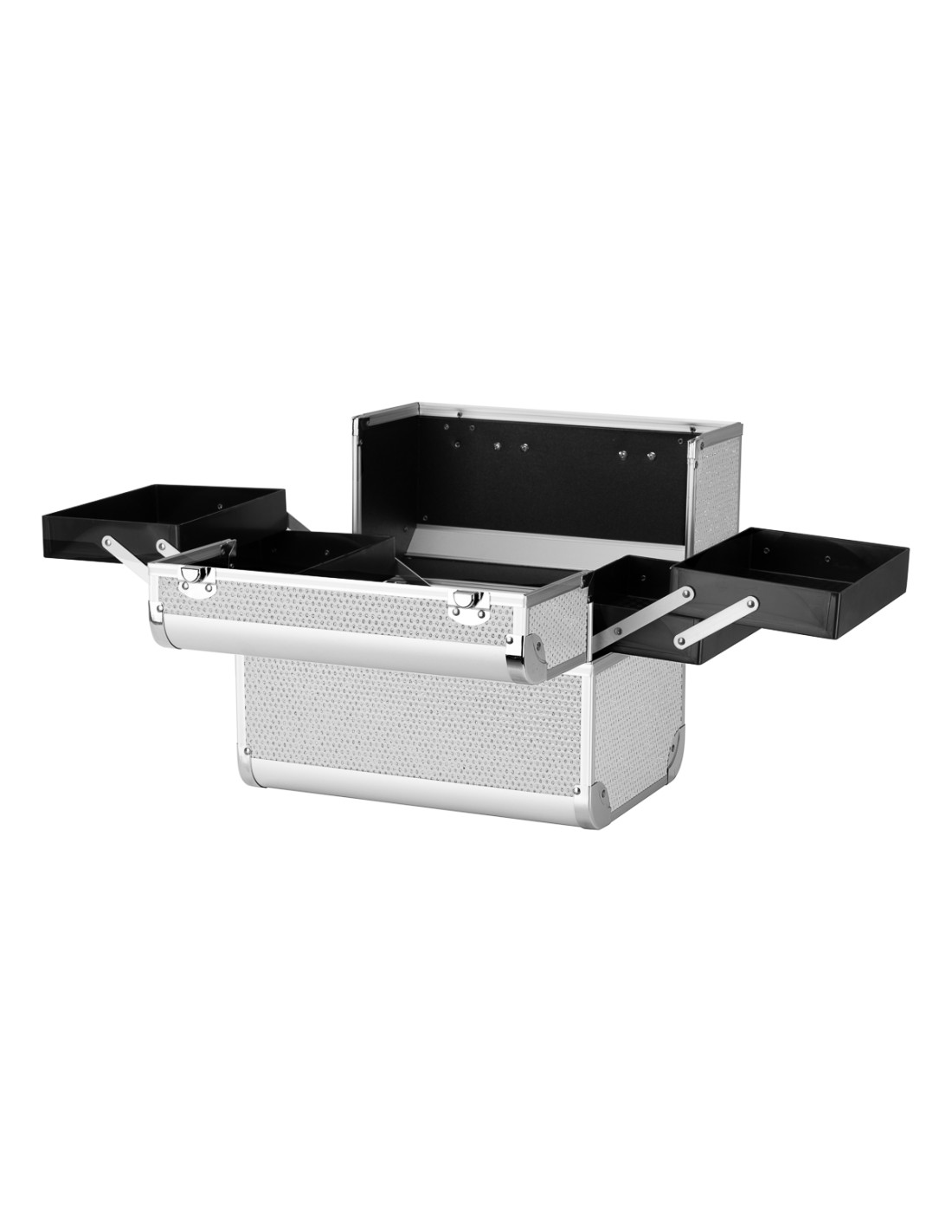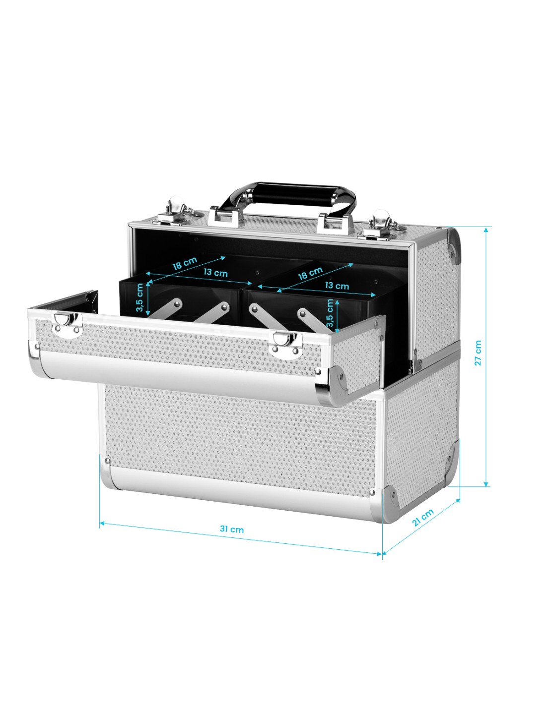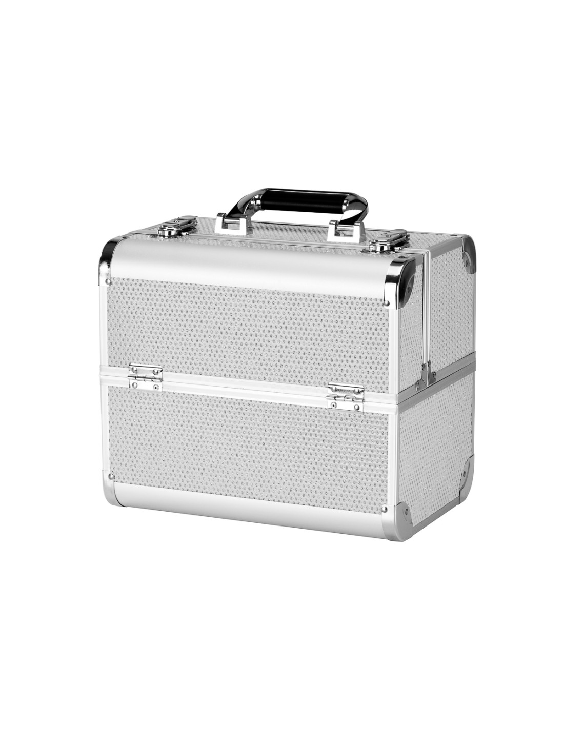 Il design moderno in tonalità argento con accenti glitterati aggiunge un tocco di eleganza. La maniglia ne facilita il trasporto, particolarmente importante per gli stilisti in movimento. Realizzata con materiali robusti e resistenti ai danni per un comfort quotidiano. Una robusta chiusura a scatto con chiave assicura la protezione del contenuto e la struttura leggera e resistente rende il baule facile da trasportare.