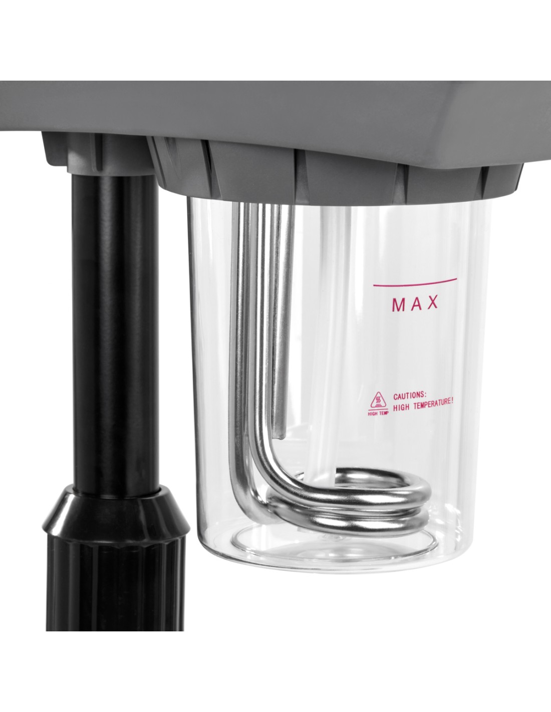 Il vaposon è realizzato in plastica in tonalità nera, che rende il dispositivo facile da mantenere pulito. Il supporto è dotato di una semplice regolazione in altezza da 78 a 95 cm, che consente di posizionare l'apparecchiatura al giusto livello per garantire il comfort della persona che esegue il trattamento. L'ugello del vaposone può essere ruotato, aumentando la gamma di impostazioni possibili. La base a quattro bracci con ruote gommate migliora la mobilità, facilitando lo spostamento dell'unità.