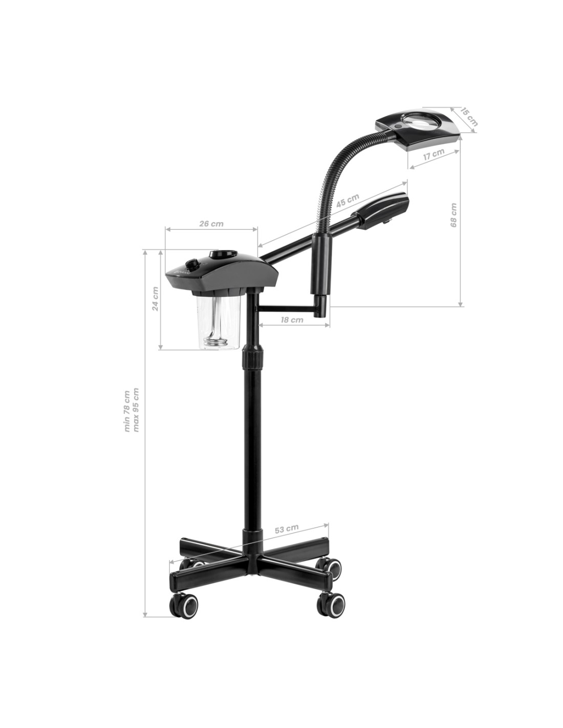 Il vaposon è realizzato in plastica in tonalità nera, che rende il dispositivo facile da mantenere pulito. Il supporto è dotato di una semplice regolazione in altezza da 78 a 95 cm, che consente di posizionare l'apparecchiatura al giusto livello per garantire il comfort della persona che esegue il trattamento. Sia la lampada di ingrandimento che l'ugello del vaporizzatore possono essere ruotati in modo indipendente, aumentando la gamma di impostazioni possibili. La base a quattro bracci con rotelle gommate migliora la mobilità, facilitando lo spostamento dell'unità.